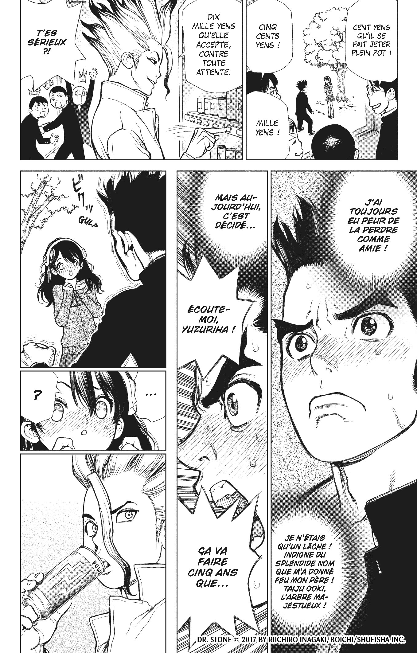 Pour le coup le nouvel arc apporte du changement, et bien que l’apparition de l’espion de Tsukasa permettait de le relier à l’arc précédent, on passe assez vite à autre chose (et c’est tant mieux !). En effet, l’histoire se concentre surtout sur le création du médicament permettant de soigner la sœur de Kohaku, et ainsi, sur l’avancée scientifique du royaume de la science. Le scénario de Riichiro Inagaki a tout de même le mérite de proposer une progression plutôt rapide de cette évolution, sans s’encombrer de détails à rallonge qui alourdirait le tout. On avance, et on avance bien, chaque chapitre amenant son petit progrès. Et pas besoin d’être un féru de physique ou de chimie pour se laisser happer par tout ça. Et bien que des explications sont fournies, l’essentiel reste la démarche. Et justement celle ci est bien construite et vraiment prenante. Petite mention spéciale pour le passage autour de l’acide sulfurique qui montre que même la nature peut se montrer dangereuse. Par contre, petite déception de retrouver un tournoi dans Dr Stone, mécanique célèbre du nekketsu (reste à savoir si cela vient de Riichiro Inagaki ou de son éditeur, mais dans tous les cas, on n’y échappe pas). En effet, bien que ça reste un grand classique des shōnens, je ne suis pas vraiment sure que le titre en nécessitait un. On note tout de même qu’il aura droit à son originalité, d’une part parce que Senku n’est pas vraiment le valeureux combattant qu’on peut avoir l’habitude de voir, mais aussi parce que les héros misent leur victoire en n’hésitant pas à organiser des matchs truqués. Ce qui est, pour le coup, assez loin des valeurs nobles des tournois du genre.