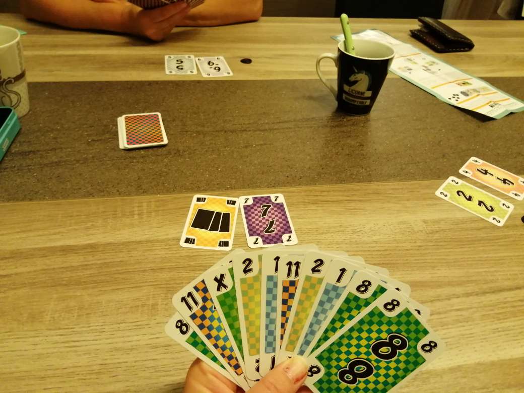 Un petit moins tout de même, il faut être à 3 joueurs minimum et en ces temps plus que sombre ce n’est pas facile de trouver un troisième joueur et les chats n’avaient pas envie de tenter le jeu avec nous. Finalement maman s’est dévouée et ce fût très drôle de la voir galérer avec ses cartes qu’elle n’avait pas le droit de ranger, maman est une joueuse de tarot et belote généralement, autant dire qu’il a été difficile de lui faire comprendre qu’il ne fallait pas toucher aux cartes !