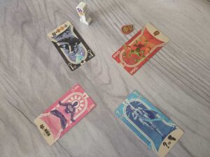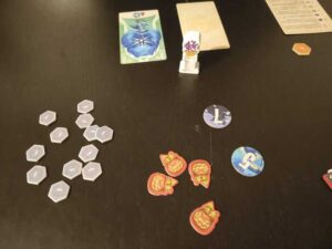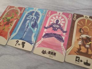 On récapitule, le but du joueur pour chaque manche, ce sera de gagner le pli pour remporter la meilleure récompense possible, au pire de faire 2nd… En ce sens, le Corbeau Liche pourrait être une très bonne option puisque son jeton est de valeur 7. La Chevalière Blanche vaut 6 points en début de partie et baisse de valeur de manche en manche. La Grenouille Invocatrice peut permettre d’augmenter sa valeur jusque 5, si elle est jouée la première. La Tortue Stratège peut être pas mal du tout si on décide de la jouer en groupe…