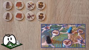 Si vous choisissez de gagner un jeton de connaissance (qui est, rappelons le, le but du jeu), il faudra pour cela ériger une stèle d’Ours sacrée dans le village où se trouve le jeton de Connaissance convoité. Dans Wangdo, le plateau est constitué d’une multitude de villages. Lors de la mise en place, vous placez un jeton de Connaissance (Religion, Éducation, Militaire ou Commerce) aléatoirement sur chacun d’eux, comme une spécialité du village. Votre prince Ours doit donc ériger des stèles sacrées en échange de la Connaissance du village.