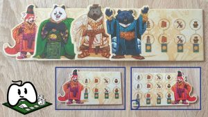 Toujours avec notre exemple dans l’image ci-dessus, on se retrouve donc à verser une stèle d’Ours sacrée bleue au temple bleu pour acquérir un jeton annoté 1. Alors que pour gagner le jeton annoté 2, il faudra verser une offrande d’une stèle d’Ours sacrée bleue au temple bleu, mais aussi une stèle d’Ours sacrée noire au temple noir.