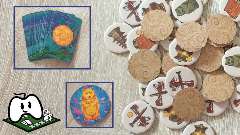 Toujours avec notre exemple dans l’image ci-dessus, on se retrouve donc à verser une stèle d’Ours sacrée bleue au temple bleu pour acquérir un jeton annoté 1. Alors que pour gagner le jeton annoté 2, il faudra verser une offrande d’une stèle d’Ours sacrée bleue au temple bleu, mais aussi une stèle d’Ours sacrée noire au temple noir.