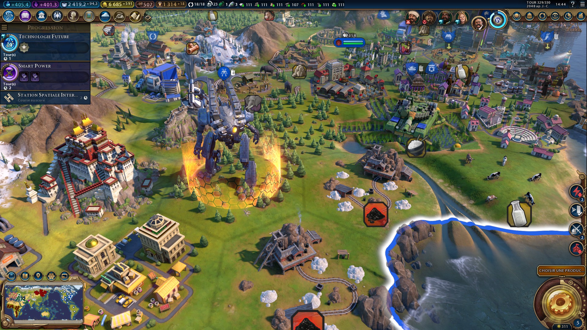 Autre nouveauté apportée par Gathering Storm : la nouvelle ère. Celle-ci se traduit par l’ajout d’un nouvel arbre technologique mais également culturel. Au niveau technologique, l’ère futuriste n’apporte hélas pas grand-chose à se mettre sous la dent. Bien que certaines technologies soient ajoutées dans les ères précédentes (parc éolien, barrage contre la montée des eaux…), la nouvelle ère n’est finalement notable que par l’ajout d’une « nouvelle » unité militaire : le robot géant de la mort (déjà présent dans la version complète de Civilization V mais non-disponible de base dans Civilization VI…), ainsi que par l’existence d’une technologie permettant de créer des aménagements de ville sur une case d’eau. Le reste, quant à lui, concerne principalement des améliorations dudit robot. Un peu léger, donc, surtout que quitte à ajouter des unités déjà existantes dans un opus précédent, il aurait été sympathique de retrouver le commando XCOM – également présent dans la version complète de Civilization V, mais absent de cette extension.