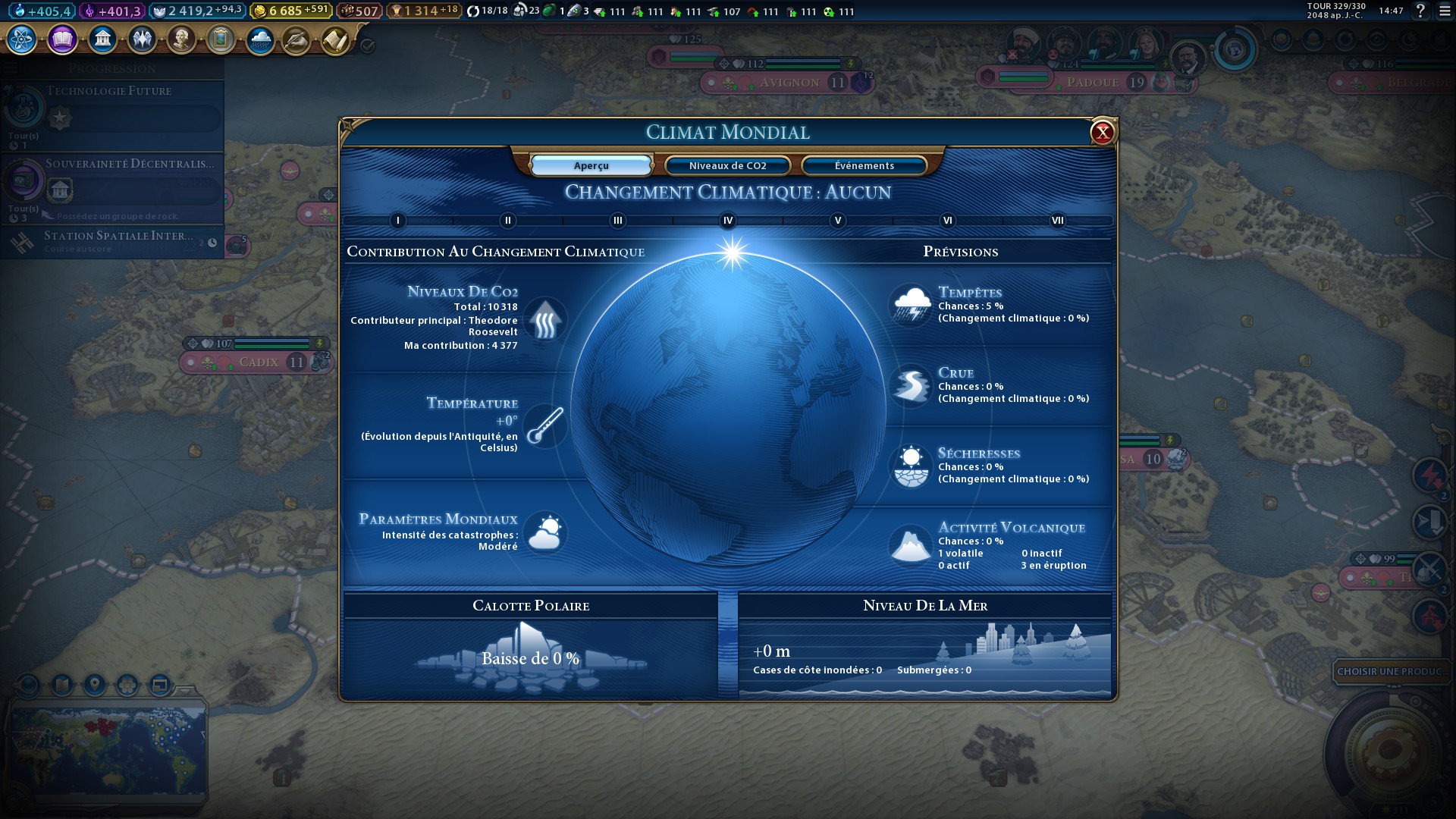 Le thème de Gathering Storm étant centré sur les changements climatiques, il est intéressant de noter que cette orientation modifie avec une certaine pertinence la gestion des ressources naturelles, bonus, et stratégiques. Au lieu d’une valeur fixe attribuée par le nombre de points de ressources possédés, les ressources sont désormais cumulables, et lesdits points de ressources vous en fournissent désormais un certain montant par tour. Concernant les ressources stratégiques, il est ainsi impératif de prendre en compte le montant maximal cumulable ainsi que le gain par tour avant de produire des unités militaires à tout va, afin de ne pas épuiser vos ressources trop rapidement, certaines unités – comme les sous-marins nucléaires ou les robots géants de la mort avec l’uranium – consommant des ressources chaque tour. Les échanges commerciaux avec les dirigeants y gagnent d’ailleurs en intérêt, avec des échanges de ressources désormais basées sur la quantité.