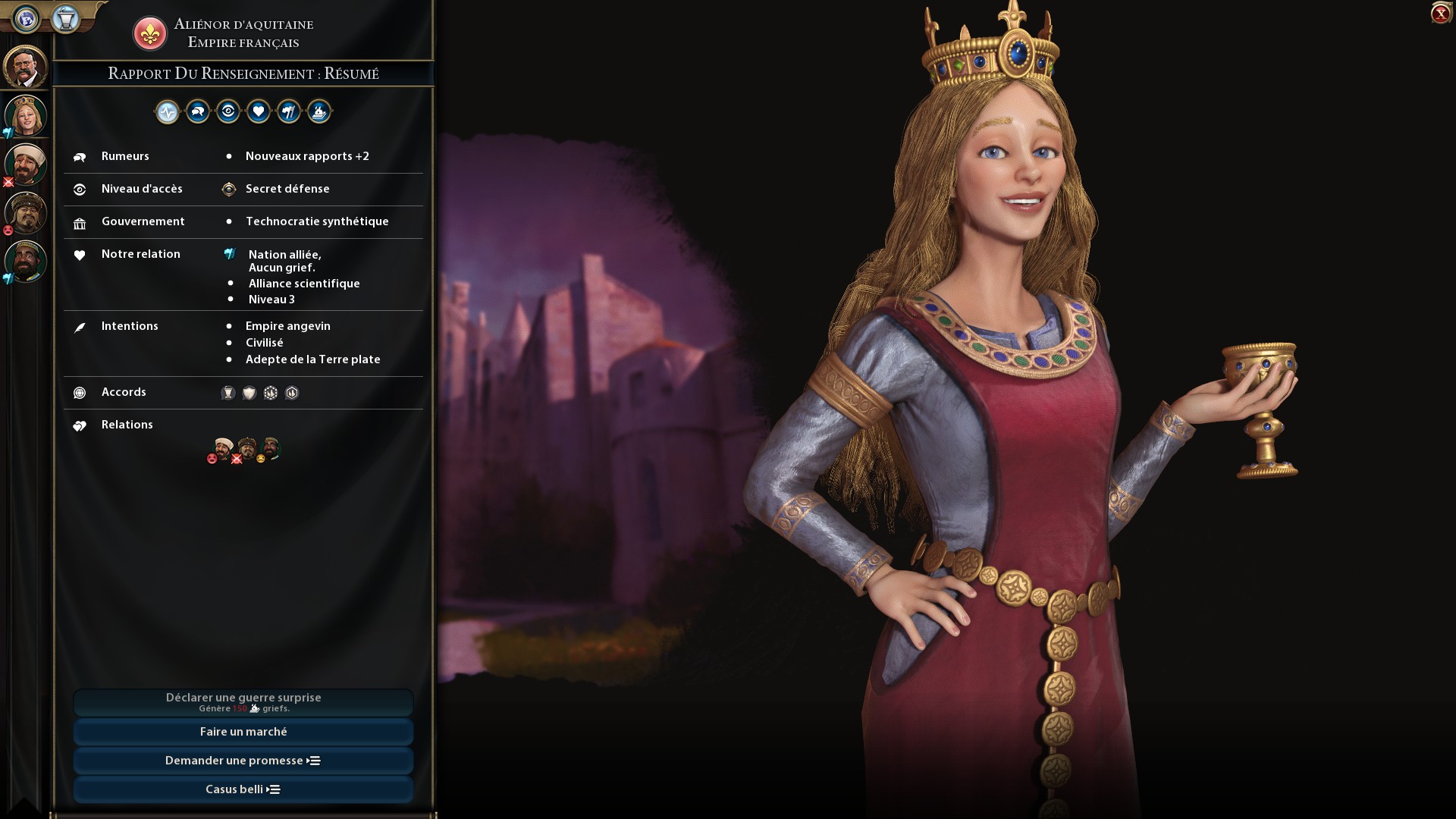 Les griefs consistent en une forme de ressources dont la valeur augmente lorsque d’autres dirigeants ne respectent pas leurs promesses ou adoptent une attitude négative à votre encontre. Vous posséderez ainsi un taux de grief pour chaque autre dirigeant, et leur valeur vous permet ainsi d’adopter des positions plus fermes vis-à-vis de l’un d’entre eux sans risquer de subir le courroux des autres. Concrètement, cela peut se traduire par une dénonciation voire une déclaration de guerre sans aucune incidence diplomatique avec vos alliés. A cela se rajoutent des casus belli adaptés à certaines situations, comme celui autorisant une déclaration de guerre après moult promesses brisées. Avant Gathering Storm, une guerre punitive avait pour conséquence d’énerver jusqu’à vos plus proches alliés qui considéraient le moindre mouvement militaire comme un trait belliqueux de votre part. Un bon rééquilibrage de la diplomatie, donc.