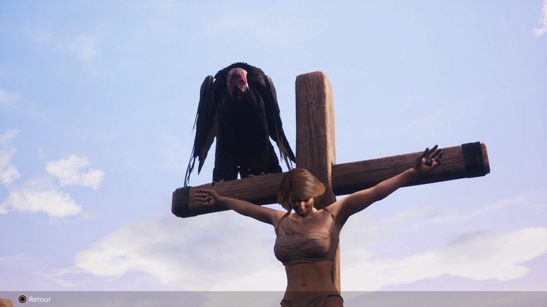 L’univers de ce Conan Exiles est l’un des piliers du titre. En plus d’être cohérent avec l’univers du célèbre Barbare, le monde d’Hyboria est tout ce qu’il y a de plus immersif. En effet, un jeu de survie dans un monde si propice à la mort est un atout non négligeable. En plus, le terrain de jeu est effectivement gigantesque, et surtout très diversifié dans ses possibilités. Pour ce qui est de l’histoire de Conan Exiles, c’est avant tout au joueur de se la raconter, et même de se l’accaparer. Pour vous y aider, Funcom met à votre disposition un contexte, mais quel contexte ! Après avoir finement opté pour un personnage, que vous aurez fabriqué de toutes pièces, que ce soit du côté physique (y compris l’apparence des attributs les plus intimes, si vous avez fait le choix de les représenter à l’écran) jusqu’à l’appartenance religieuse, cet avatar se retrouve en bien mauvaise posture. Crucifié au beau milieu du désert, pour des crimes qui posent l’ambiance (on vous en laisse la surprise), rien ne paraît être en capacité de nous sauver d’une mort certaine. Rien, sauf Conan le Cimmérien lui-même, qui nous décroche, puis nous laisse seul face à notre destin.