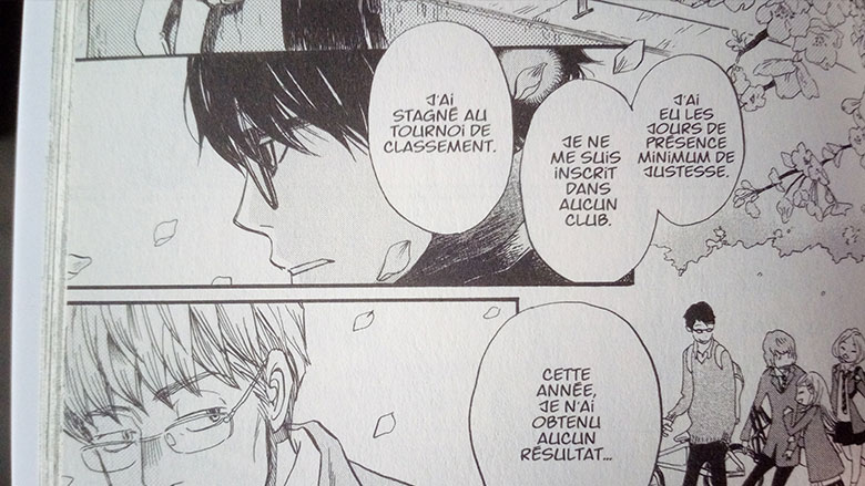 La grande force de March Comes In Like A Lion, et cela se constate très rapidement au sein du tome 1, c’est le réalisme avec lequel Chica Umino décrit certaines situations ainsi que la justesse du cheminement de pensée de ses personnages. Dans les mini-histoires annexes présentes à la fin de certains tomes, on apprend que la mangaka effectue un véritable travail de recherche concernant certains sujets comme le shôgi, en étudiant à la fois le jeu en lui-même mais également les humains qui gravitent autour. Cette attention portée à l’humain se ressent tout au long de l’histoire, avec des personnages forts et réalistes, qu’on se surprend parfois à aimer ou à détester avec la même intensité que dans la vie réelle. Cela se constate aussi dans les détails apportés à la psychologie et à la vie des personnages les plus secondaires, comme ces adversaires d’âge mûr que Rei doit battre au cours d’une compétition et qui possèdent chacun leurs motivations et leurs problèmes que Rei a bien du mal à comprendre et à gérer.