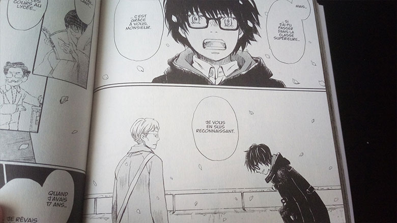 Si l’anime s’est arrêté à un stade précis de l’histoire et que nous ignorons pour le moment si celui-ci connaitra une suite, le manga March Comes In Like A Lion est quant à lui toujours en cours, avec 14 tomes actuellement disponibles en France et un 15ème qui est sorti au Japon à la fin du mois de décembre 2019. Pour cet article, nous nous sommes contentés de travailler sur les cinq premiers tomes, ceux-ci introduisant déjà un début d’histoire assez dense en situations et en réflexions. Et outre les thématiques liées aux dilemmes personnels de Rei, ces cinq premiers tomes mettent en place d’autres histoires à thèmes. On notera, parmi lesdits thèmes, le sujet de la culpabilité de la victime, celui de la quête de reconnaissance familiale et les fractures émotionnelles engendrées en son absence, l’adultère, la complexité de l’humain et son spectre émotionnel en zones de gris, ou encore le sacrifice de soi en faveur des autres. La fin du tome 5, d’ailleurs, annonce un des thèmes majeurs qui sera abordé à partir du tome 6 : le harcèlement scolaire. Autant de sujets importants que Chica Umino traite avec rigueur et sérieux, et que la mangaka fait porter sur les épaules de personnages qui brillent par leur humanité (pour le meilleur comme pour le pire).