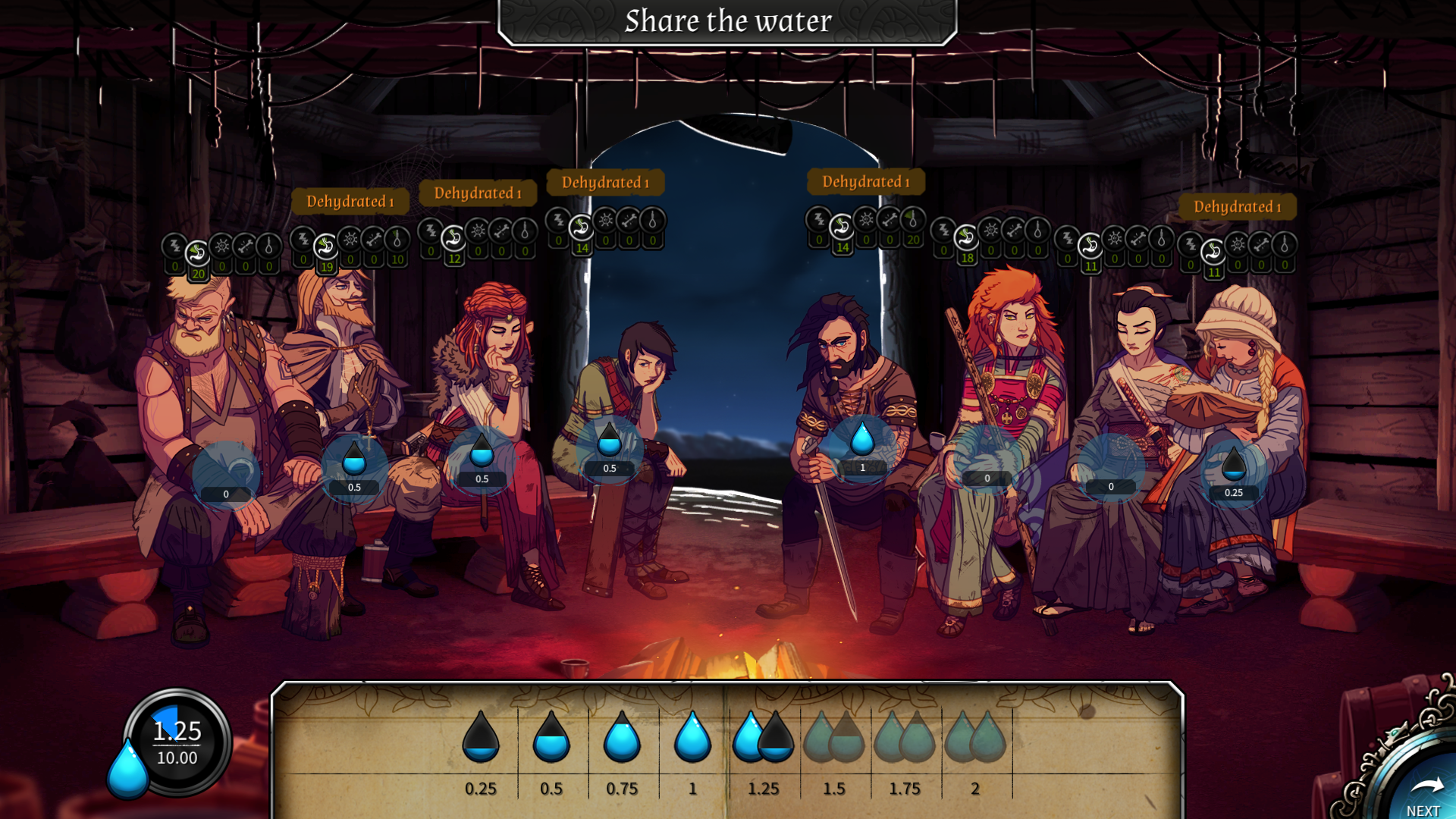 Le bois, le feu et l’eau : trois éléments indissociables et obligatoires pour garder la tête hors de l’eau. Le bois sert à alimenter le feu, qui vous permet de fabriquer de l’eau potable entre autres. Si votre feu s’éteint c’est la cata : plus d’eau potable, plus de lumière, plus de chaleur la nuit. Un conseil, gardez toujours un œil sur l’état de votre feu. A la nuit tombée, vous pourrez nourrir et/ou abreuver vos personnages. Le système de réhydratation (image ci-dessus) est basé sur une probabilité en fonction de la quantité d’eau que vous attribuerez à chacun. Un système qui paraîtra surement injuste et nécessite, selon moi, un petit rééquilibrage. La nuit est aussi le moment durant lequel les dialogues se déroulent. L’ambiance générale variera en fonction de vos choix. Et si la dépression augmente, rien ne vaut une bonne bière pour redonner le sourire !