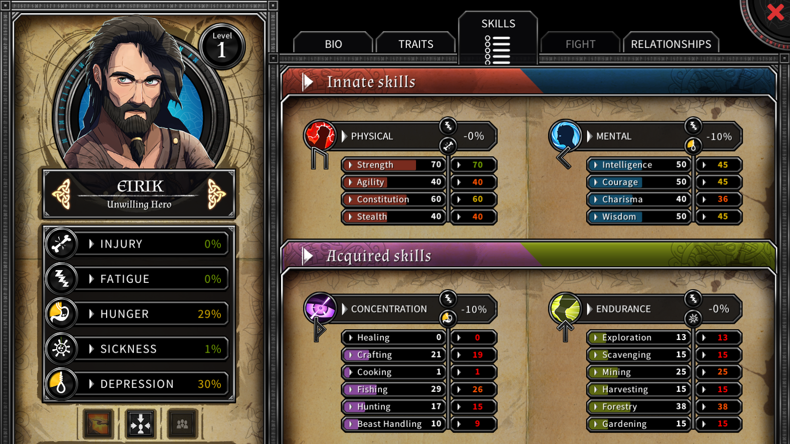 Vous commencez avec Eirik, sa femme Blodeuwedd, leur fille Kari et Moira la sœur de Blodeuwedd. Comme dit précédemment, les relations peuvent évoluer et vos choix influenceront le tempérament de chacun des membres. Aspect très important car la dépression règne sur les rescapés. Sachez qu’il y aura en tout quatorze personnages jouables. Vous rencontrerez ces derniers aléatoirement en fonction de votre exploration. A noter qu’ils sont tous crédibles et ancrés dans l’histoire de Dead in Vinland. A vous de décider de les ramener au camp ou pas… L’union fait la force mais nécessite une meilleure organisation et, surtout, plus de ressources. Et qui dit aventure dit grand méchant ! Un tyran viendra à votre rencontre pour asseoir son autorité et reviendra tous les sept jours réclamer un tribut de dix unités de bois (au début après ça sera plus dur). Il est bon de savoir que l’île regorge de mystères à percer dont l’identité de ce tyran. Le jeu comporte deux fins et se termine en 100 jours de survie environ soit à peu près une trentaine d’heures. A titre d’exemple, j’ai joué environ une heure et survécu cinq jours.