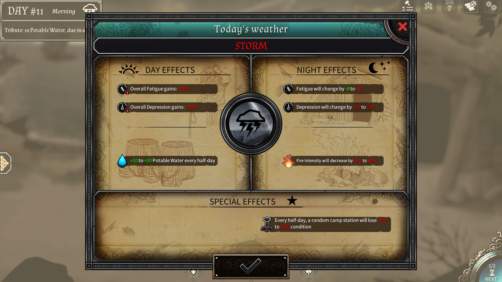 Là où Dead in Vinland fait fort, c’est sur la matérialisation de la météo et ses conséquences. La pluie vous ramènera de l’eau potable et non potable en quantité mais fera déprimer votre groupe et consommera votre feu plus rapidement. A l’inverse, un grand soleil sera bon pour la santé mentale mais vos personnages auront chaud et soif. Je n’ose imaginer ce qu’il se passera quand la sécheresse ou une tempête s’abattra sur votre camp…