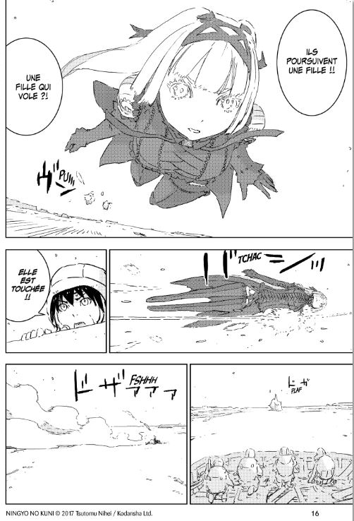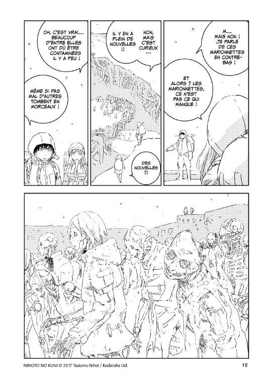 Un monde de marionnettes, c’est particulier et il faut avouer que le dessin du mangaka l’est tout autant. En ouvrant Aposimz, vous constaterez que les quatre premières pages ne reflètent pas du tout ce qui nous attend en matière de détails. Ces pages expliquant le synopsis sont bien fournies, les suivantes perdent en couleur et en minutie. De ce fait, on a du mal à concevoir une lecture mémorable avec de tels dessins qui perdent en qualité, ces teintes souvent pauvres et bien trop claires, on se demande même si les planches sont terminées. On s’interroge alors sur le pourquoi du comment. Peut-être Tsutomu Nihei a-t-il souhaité accentuer l’environnement glacial que subissent les habitants, le monde dévasté et qui peine à se relever de la guerre contre le monde souterrain, mettant en relief ce sentiment d’abandon et de précarité de la population ?