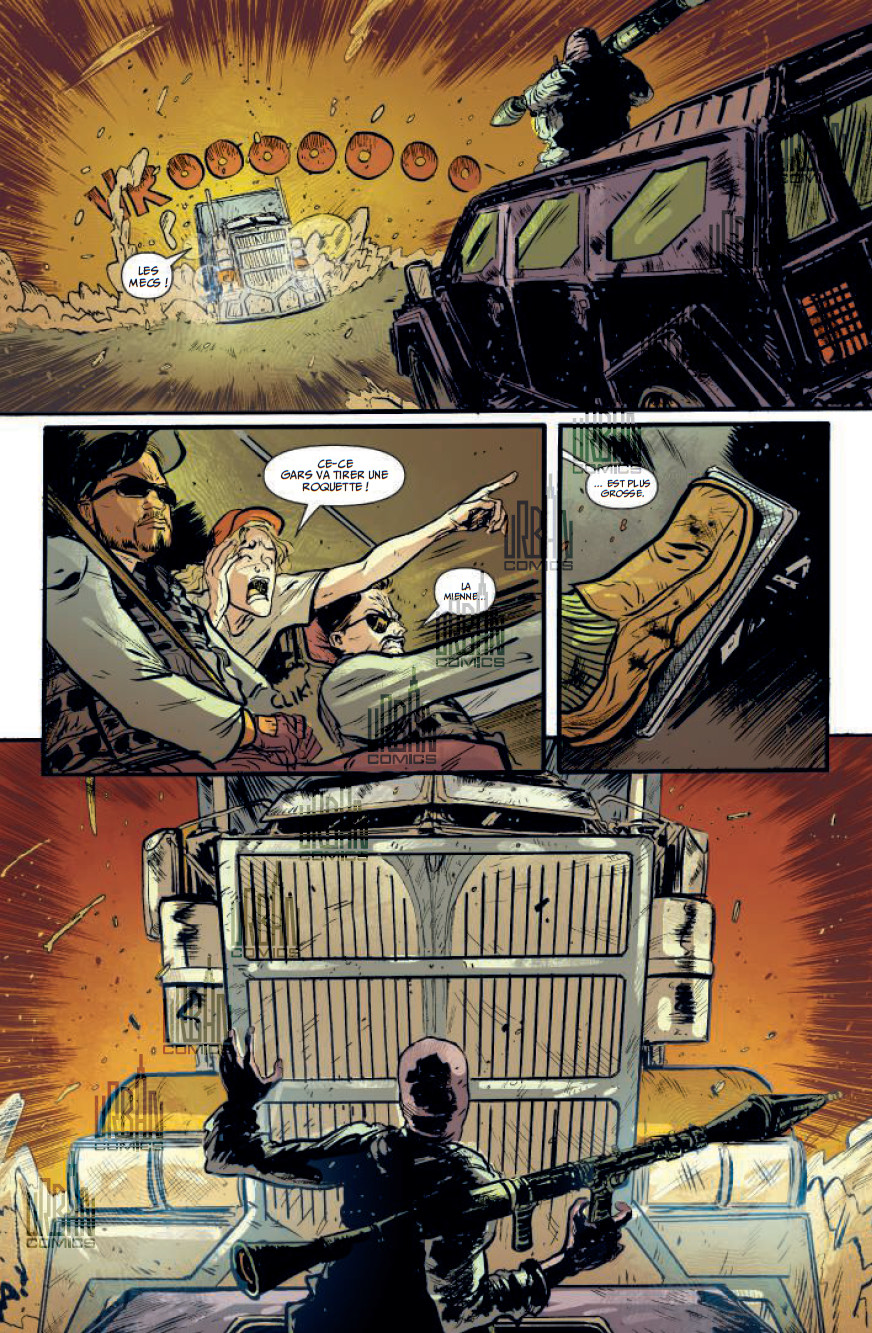 Cette planche en est peut-être l’exemple le plus parlant : la première case retranscrit l’impression de vitesse par sa palette de couleurs et son traitement de la lumière, la seconde montre Trace dans le rôle de conducteur tendu et concentré à l’extrême. Quant à la dernière, elle reprend les codes couleurs de la première et met en scène l’inexorabilité de son avenir à court terme quand un US Truck boosté vous fonce dessus à 150 km/h.