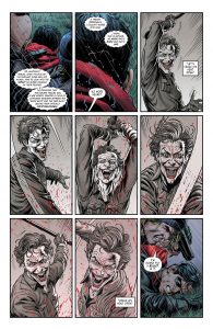 Trois crimes sont commis simultanément, trois crimes où les témoins ont vu le Joker. Chacun de ces avatars faisant référence, par ses vêtements et son esthétisme, à une étape de la vie du clown, à un moment d’importance dans celle de nos héros : La première rencontre sous l’avatar de Red Hood, l’agression de Batwoman et celle de Jason. Trois versions du clown qui font écho à la question que posa le Batman lorsqu’il eu accès à la connaissance infinie : Qui est le Joker ? Interrogé sur la réponse obtenu Bruce Wayne répondra qu’il n’obtint pas de nom, mais que la réponse était : Il y existe 3 Jokers.