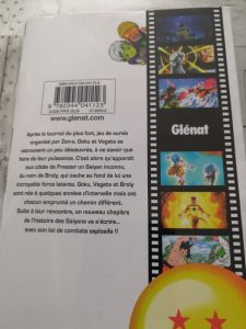 La quatrième de couverture n’est pas non plus laissée de côté. Nous retrouvons un petit résumé de l’histoire mais surtout six images présentées sous forme de pellicule. Ce sont six moments forts du film dans lequel apparaissent Freezer, Vegeta, Piccolo, Broly ainsi que le père de Goku, Bardack. En bonus et surgissant de nulle part, deux nouveaux personnages qui ont été appréciés par les fans, Cheely et Lemo. Enfin puisqu’ils ont un rôle considérable dans Dragon Ball Super Broly, Glénat a tout de même pensé à intégrer aussi une des sept dragon balls