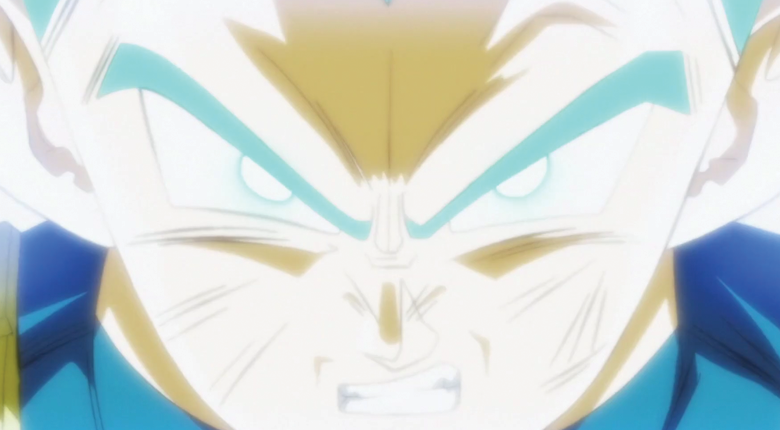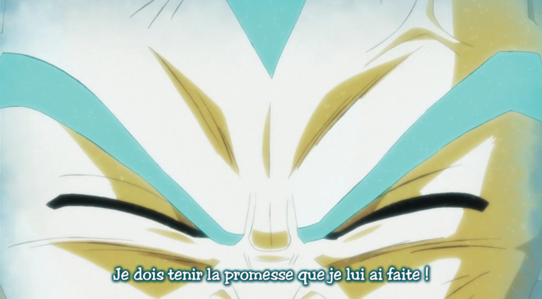 C’est pourtant après un Final Flash de compétition que Vegeta est mis hors course par la contre-attaque d’un Jiren qui se contente – comme à son habitude – de clore l’affrontement en prenant la pose. Alors que Goku prend la relève et rivalise d’ingéniosité pour créer une ouverture, celui-ci manque de peu d’expulser Jiren de la zone de combat, et le numero uno des Pride Troopers revient à la charge en augmentant sa jauge de badasserie d’un cran. Toutefois, le Vegeta qui se battait il y encore a quelques secondes par pure fierté saiyanne se remémore soudainement la promesse faite à Cabbe/Kyabe de ressusciter l’univers 6 via les Dragon Ball géantes. Et alors que Goku rassemble ses forces pour atteindre de nouveau le SSJ Blue en le combinant avec le Kaïoken x10, Vegeta puise sa force dans cette promesse qu’il refuse de trahir, au point de briser les limites de son potentiel d’après les paroles du grand prêtre.