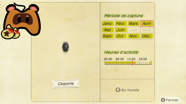 D’ailleurs, si Djason passe sur votre île, sachez que le PNJ est très friand d’insectes, tellement qu’il vous les achètera 1.5 fois leur prix (par exemple, la Piéride de la rave qui se vend 160 clochettes chez Méli & Mélo se vendra 240 clochettes pour Djason… Alors certes pas très intéressant pour ce petit papillon, mais si vous avez des Tarentules ou des Scorpions…). Il vous fera également des statues à l’égérie des insectes de votre choix en échange de trois exemplaires de ladite bestiole. Il est également bon de noter qu’il sera présent de 5h du matin, jusqu’à 5h le lendemain (hors week-end).