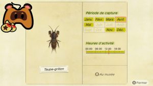 Tout d’abord, avant que celui-ci n’arrive, vous n’avez plus qu’aujourd’hui pour capturer la seule espèce que nous verrons quitter nos îles ce mois-ci : le taupe-grillon. Il vous faudra donc vite l’attraper pour compléter votre bébêtopédie (ou attendre patiemment son retour en novembre). Si cela n’a pas encore été fait, je vous rappelle qu’il faut le débusquer en creusant sous terre lorsque vous entendez le bruit du grillon à son apogée.