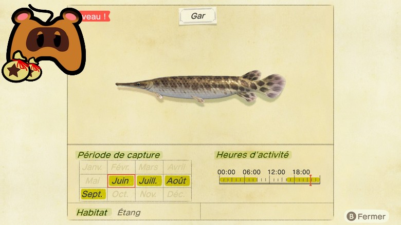 Comme vous avez pu le voir, il existe pléthore de poissons dans la mer, les rivières et les étangs de votre paradis insulaire. En effet, dans Animal Crossing New Horizons, en plus d’avoir une multitude de choses à faire, vous pouvez également prendre le temps de pécher. Pas question ici de les manger, non, mais plutôt de les attraper pour les vendre ou les donner à Thibou. En effet, tout comme les fossiles, ou encore les insectes et les œuvres d’arts, une galerie est réservée aux poissons et il faudra donc donner au conservateur, un poisson de chaque espèce pour compléter cette partie du Musée (et par la même occasion terminer votre badge du programme Miles Nook).