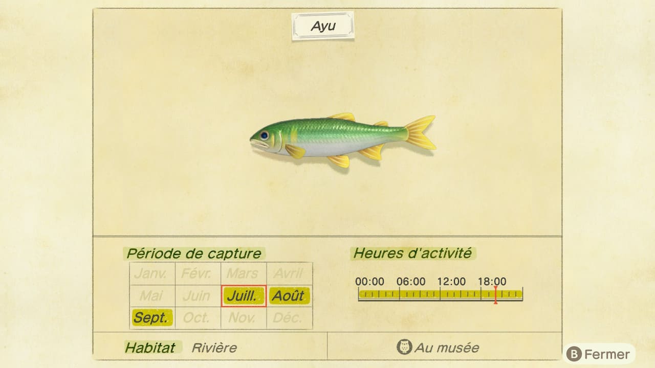 Du côté du bestiaire aquatique qui débarquent au mois de juillet, ce n’est pas un, pas deux, mais bien 5 nouveaux poissons que nous pourrons capturer! Le premier d’entre eux sera dans les rivières : Ayu. Trois autres poissons se trouveront dans la mer : Poisson-porc-épic, Lune de Mer et Napoléon. Enfin, un poisson est à retrouver via le ponton : Marlin bleu. En plus de la galerie suivante, vous pourrez les retrouvez plus en détails dans les onglets ci-dessous, en compagnie de tous les poissons que vous pourrez capturer durant le mois de juillet.