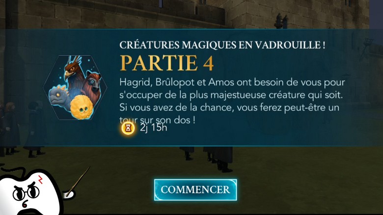 Comme les autres, la quête «Les Créatures Magiques en Vadrouille » dans Harry Potter Hogwarts Mystery semble relativement simple. La seule complexité réside dans le temps pour l’accomplir : les joueurs n’ont que quatre jours pour compléter les différentes parties. Et cette fois encore, c’est bien quatre parties qui compose cette quête secondaire. Chacune d’elle possède des tâches diverses que je vais vous reporter au mieux dans cet article, tout au long de mes découvertes.