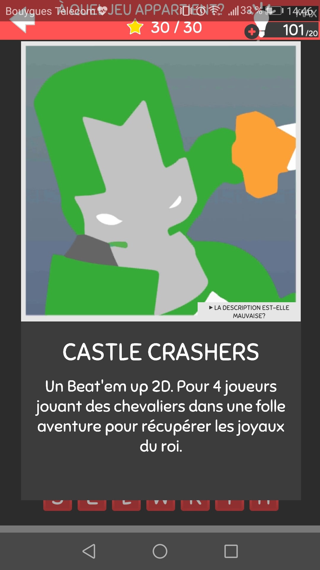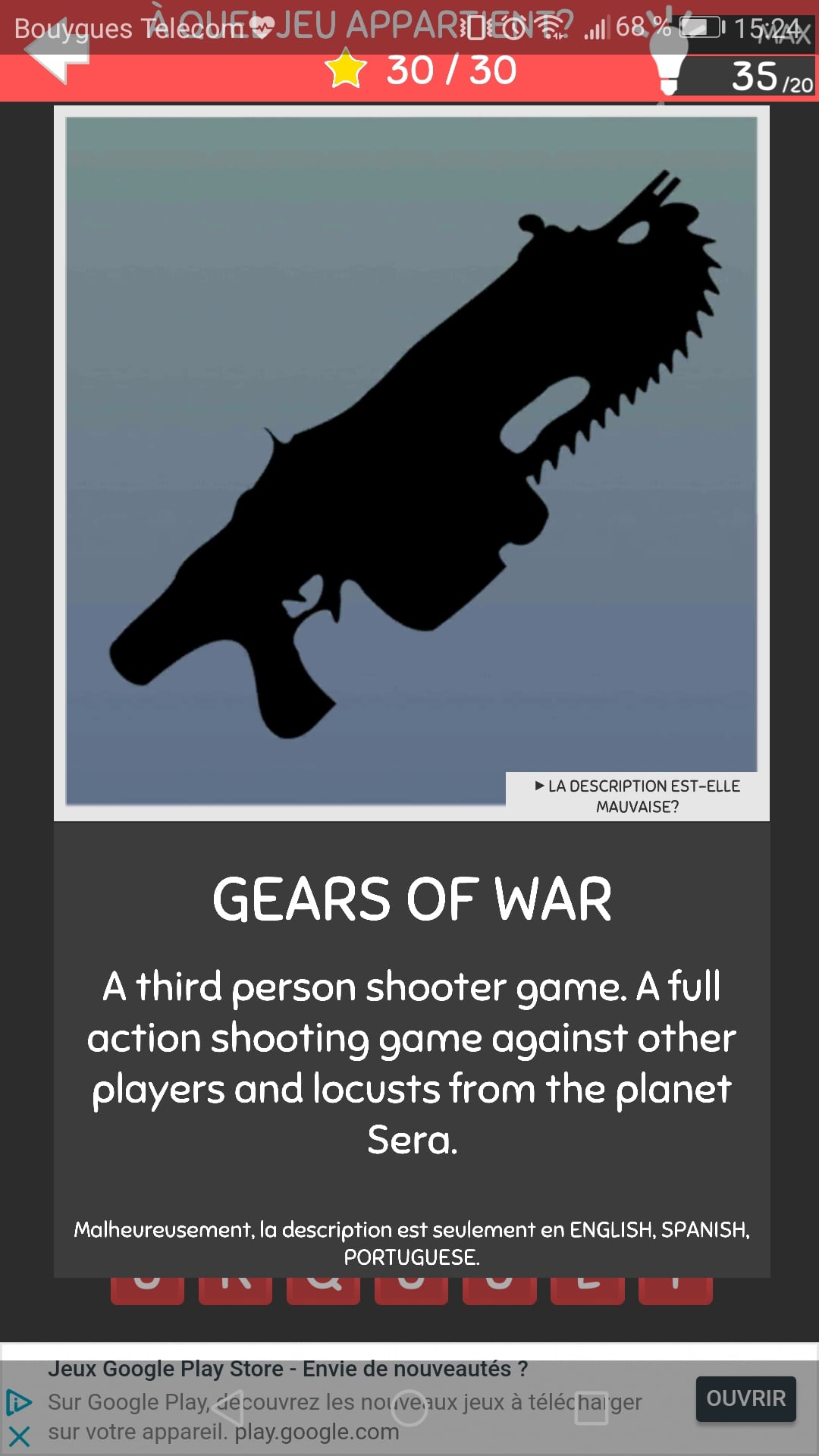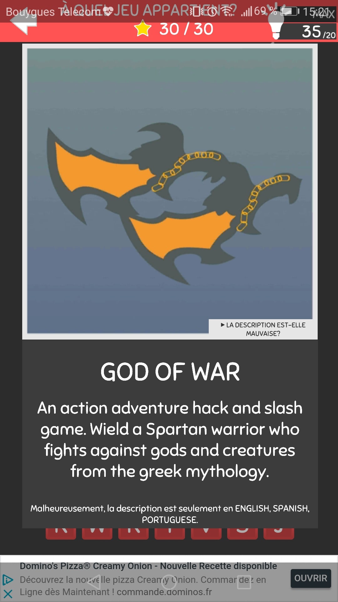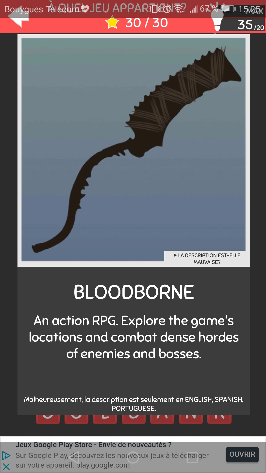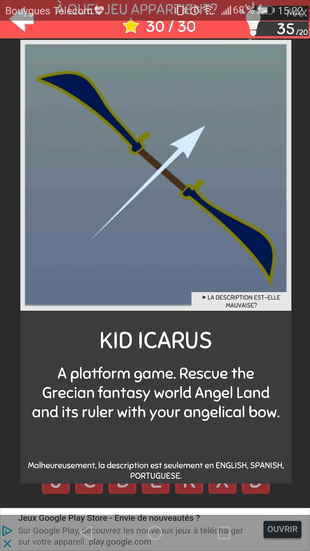 Mega Quiz Gaming est une application qui teste votre culture dite « gaming » à travers des images. Le principe est simple, il existe plusieurs thèmes et chacun comporte une trentaine d’images. Sous celles-ci, vous trouverez des lettres qu’il faudra reconstituer avec pertinence pour retrouver l’intitulé du jeu vidéo. Il est plutôt agréable d’y voir divers dessins ou symboles et presque jamais avec le même pinceau. Pour vous aider, l’application dispose d’un système d’indices que l’on obtient en obtenant des bonnes réponses ou en s’infligeant des dizaines de secondes de pub, ce qui n’est jamais agréable. C’est pourquoi, votre serviteur ici présent a sacrifié de son temps pour partager toutes les réponses du titre, si jamais vous en avez besoin.