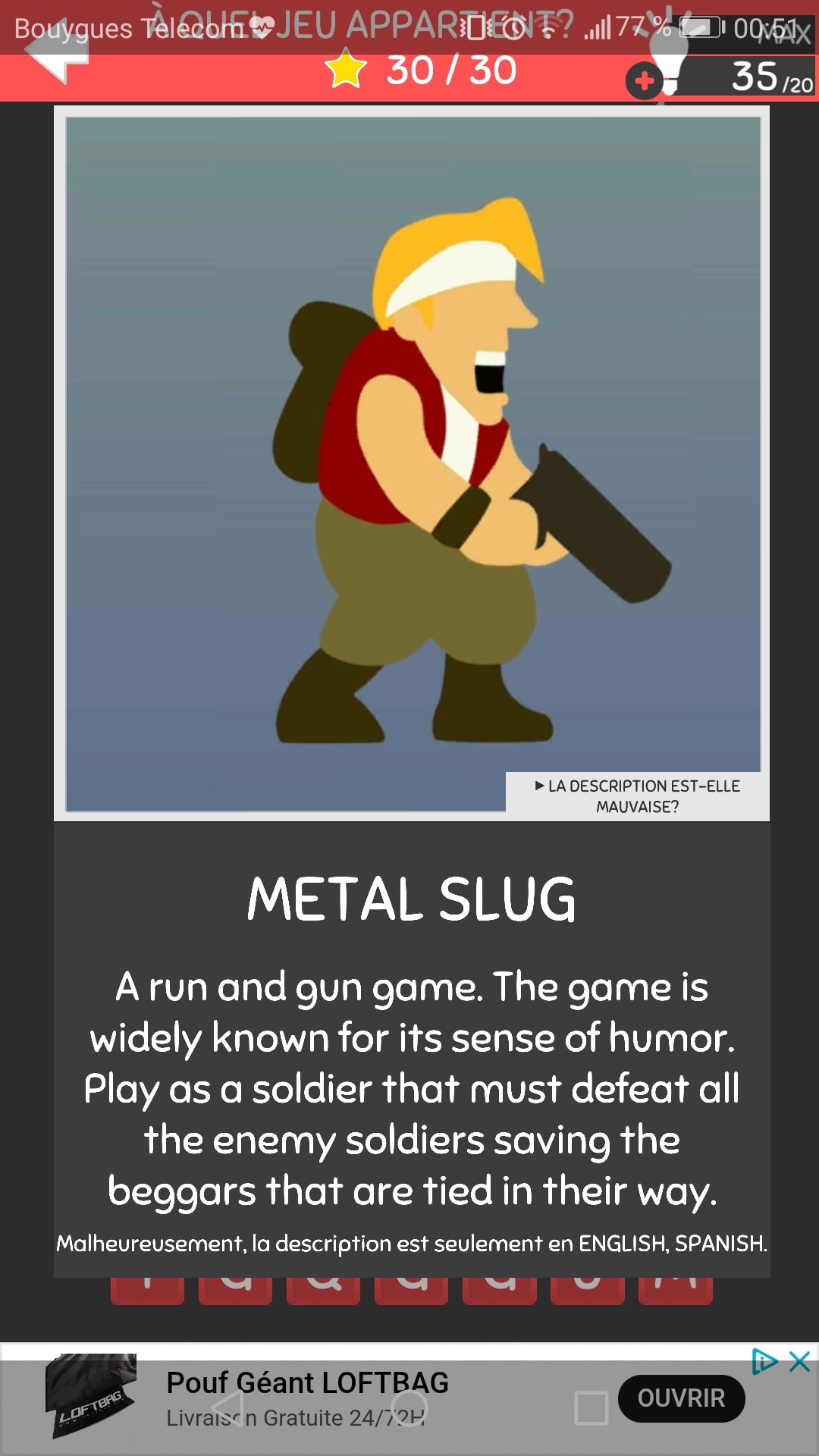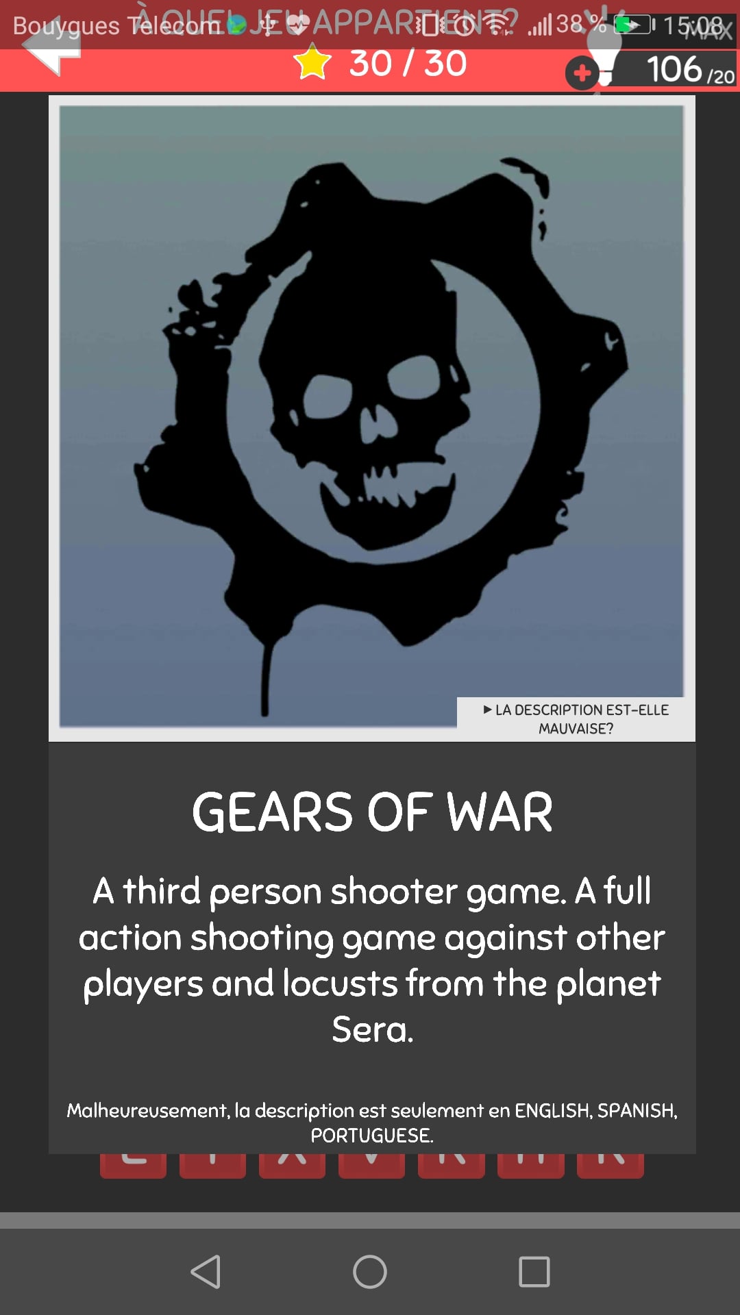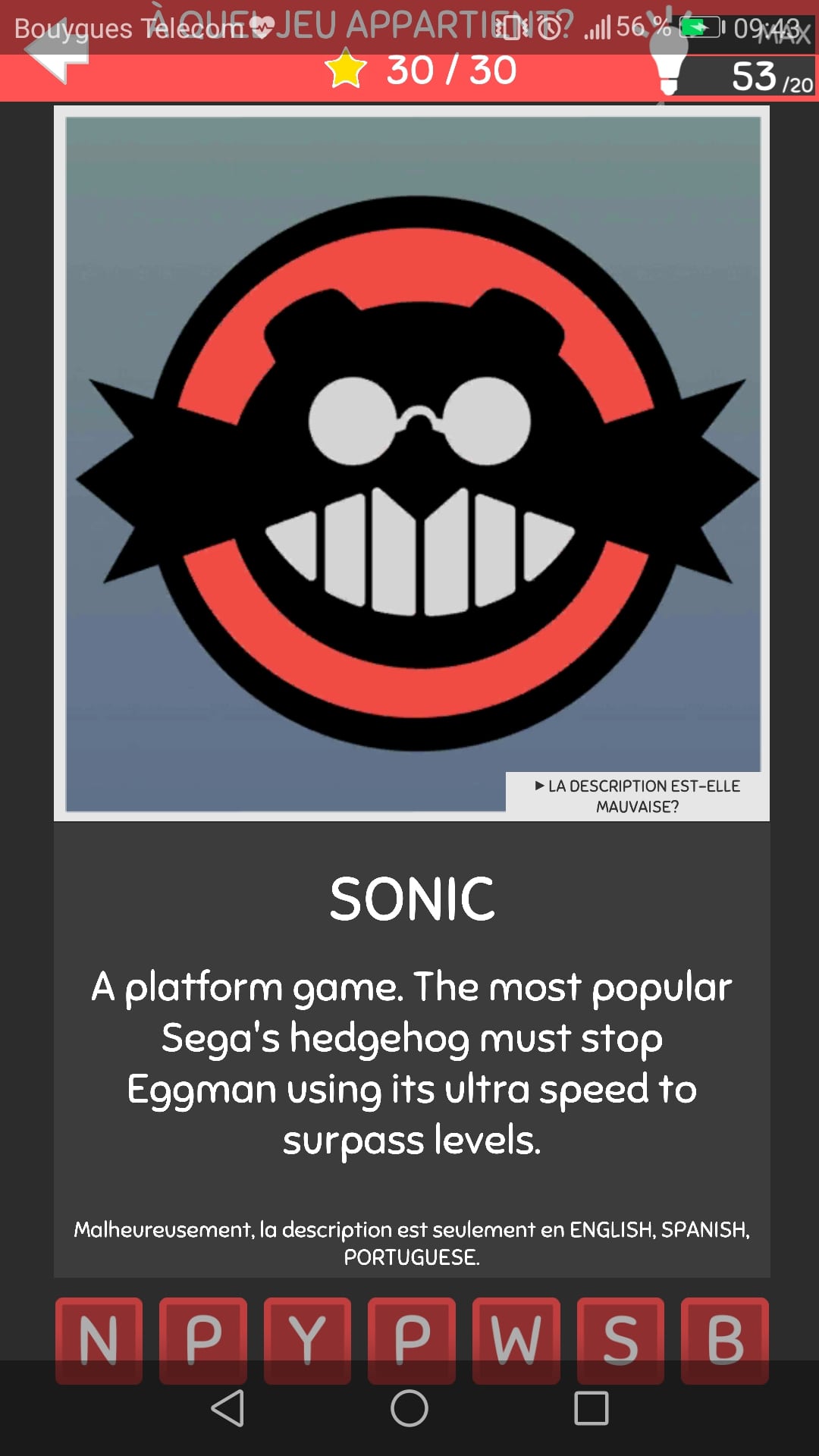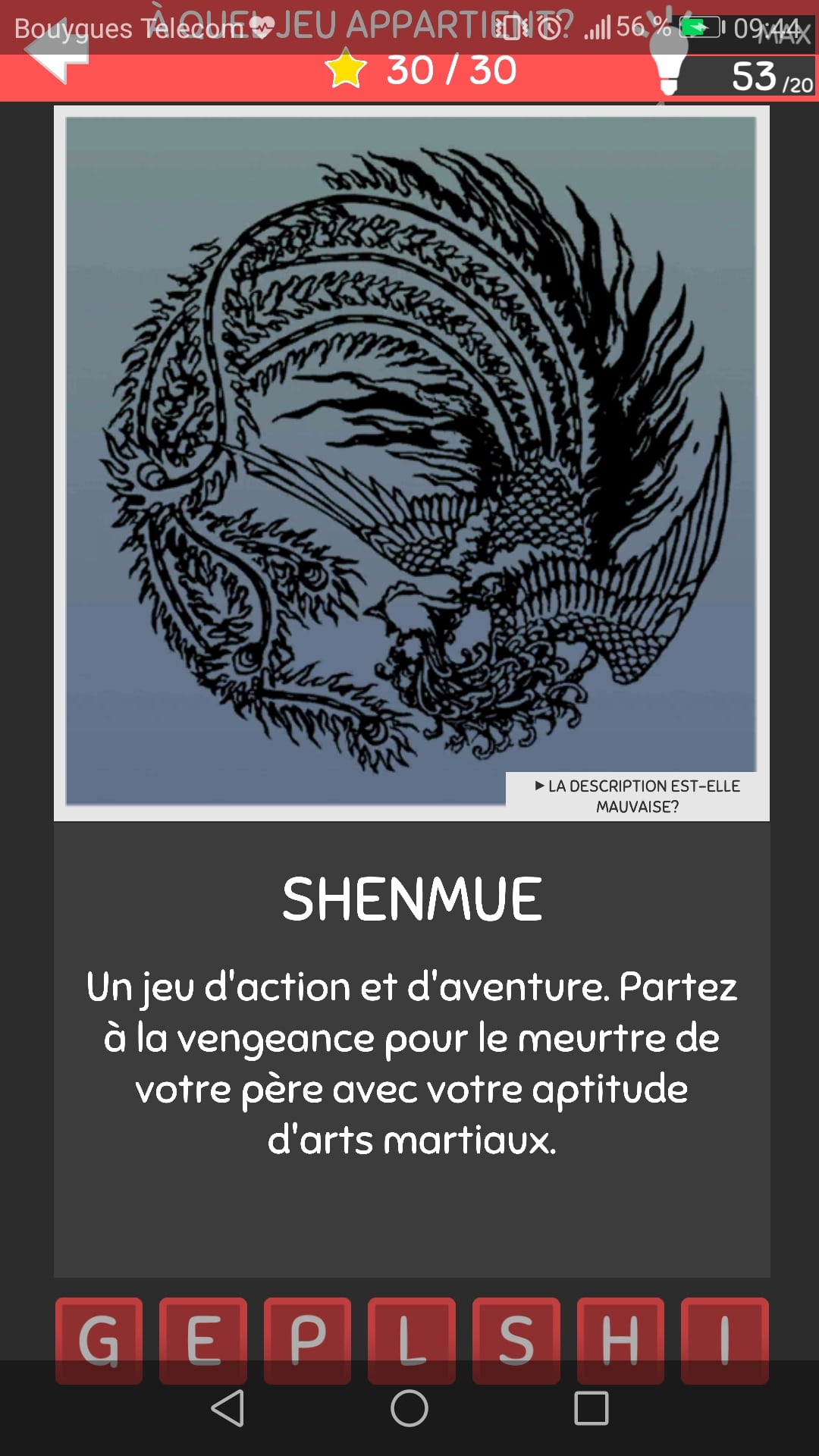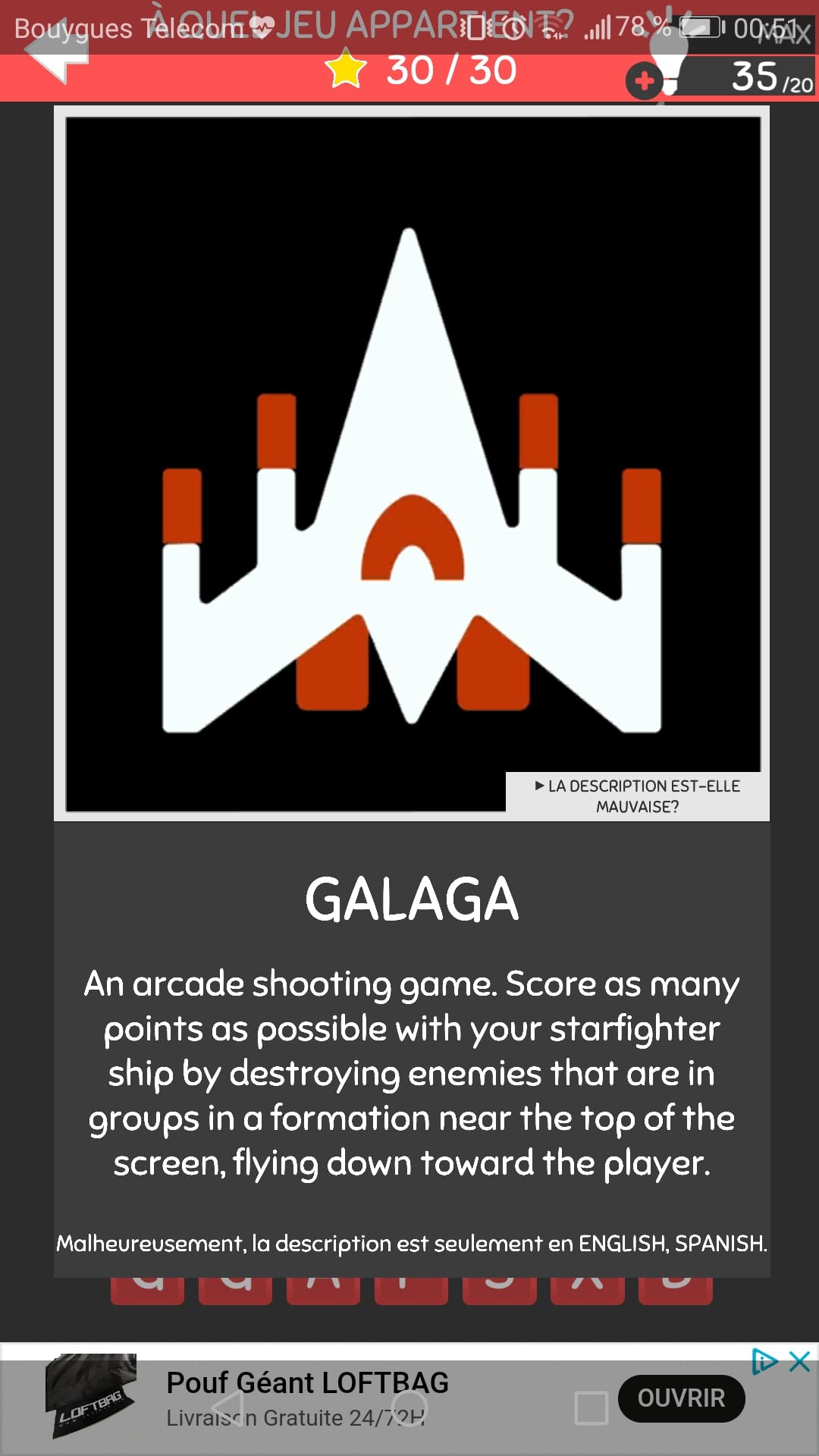 Mega Quiz Gaming est une application qui teste votre culture dite « gaming » à travers des images. Le principe est simple, il existe plusieurs thèmes et chacun comporte une trentaine d’images. Sous celles-ci, vous trouverez des lettres qu’il faudra reconstituer avec pertinence pour retrouver l’intitulé du jeu vidéo. Il est plutôt agréable d’y voir divers dessins ou symboles et presque jamais avec le même pinceau. Pour vous aider, l’application dispose d’un système d’indices que l’on obtient en obtenant des bonnes réponses ou en s’infligeant des dizaines de secondes de pub, ce qui n’est jamais agréable. C’est pourquoi, votre serviteur ici présent a sacrifié de son temps pour partager toutes les réponses du titre, si jamais vous en avez besoin.