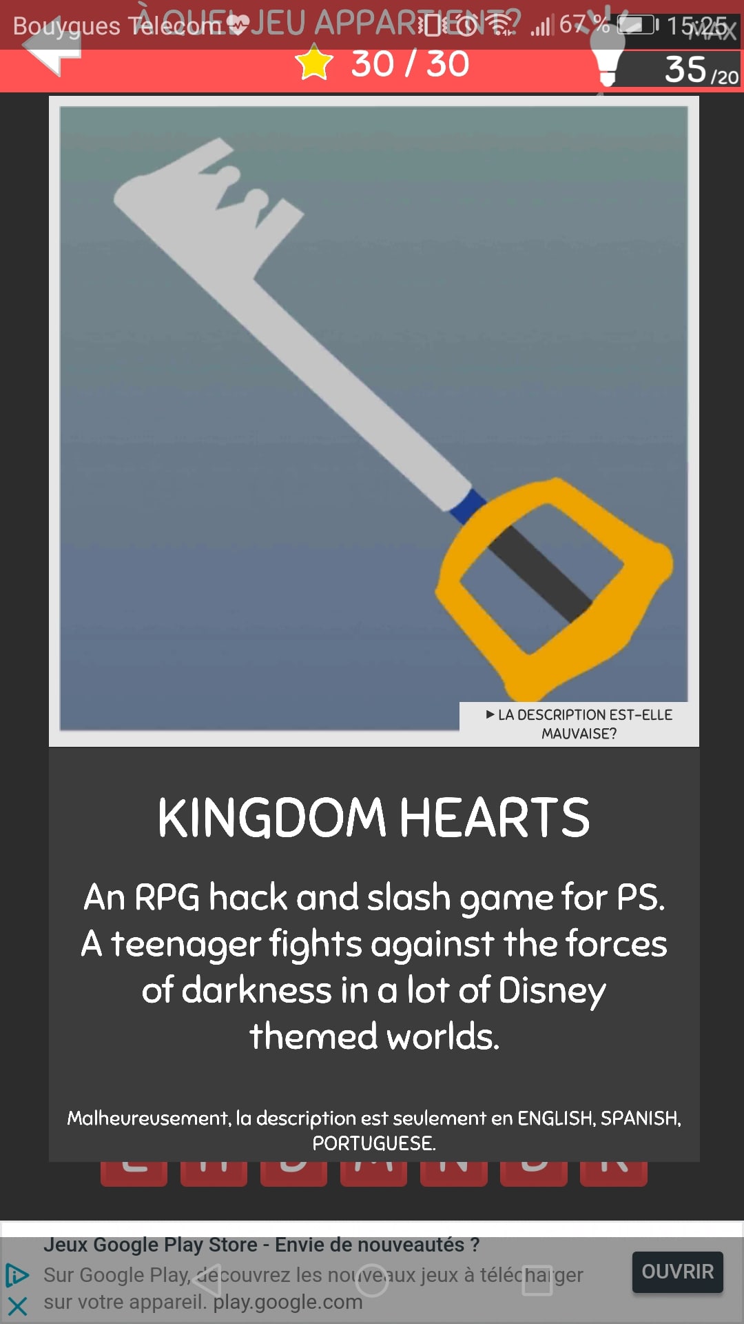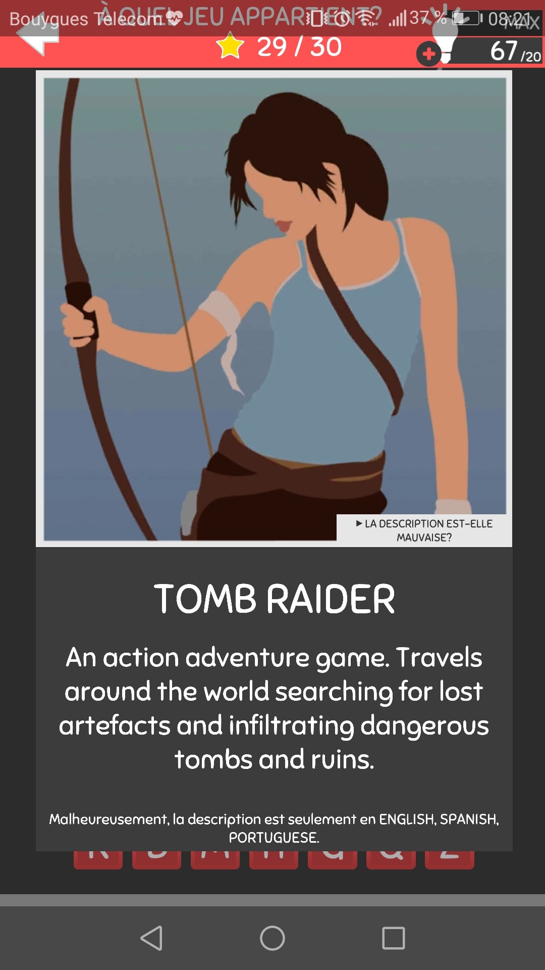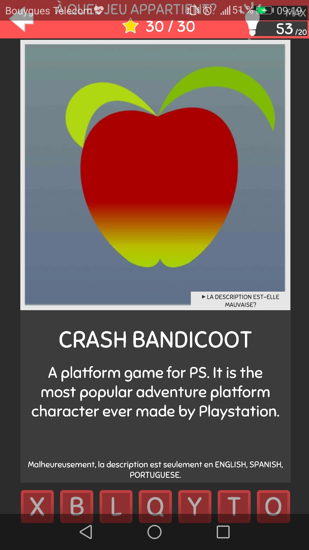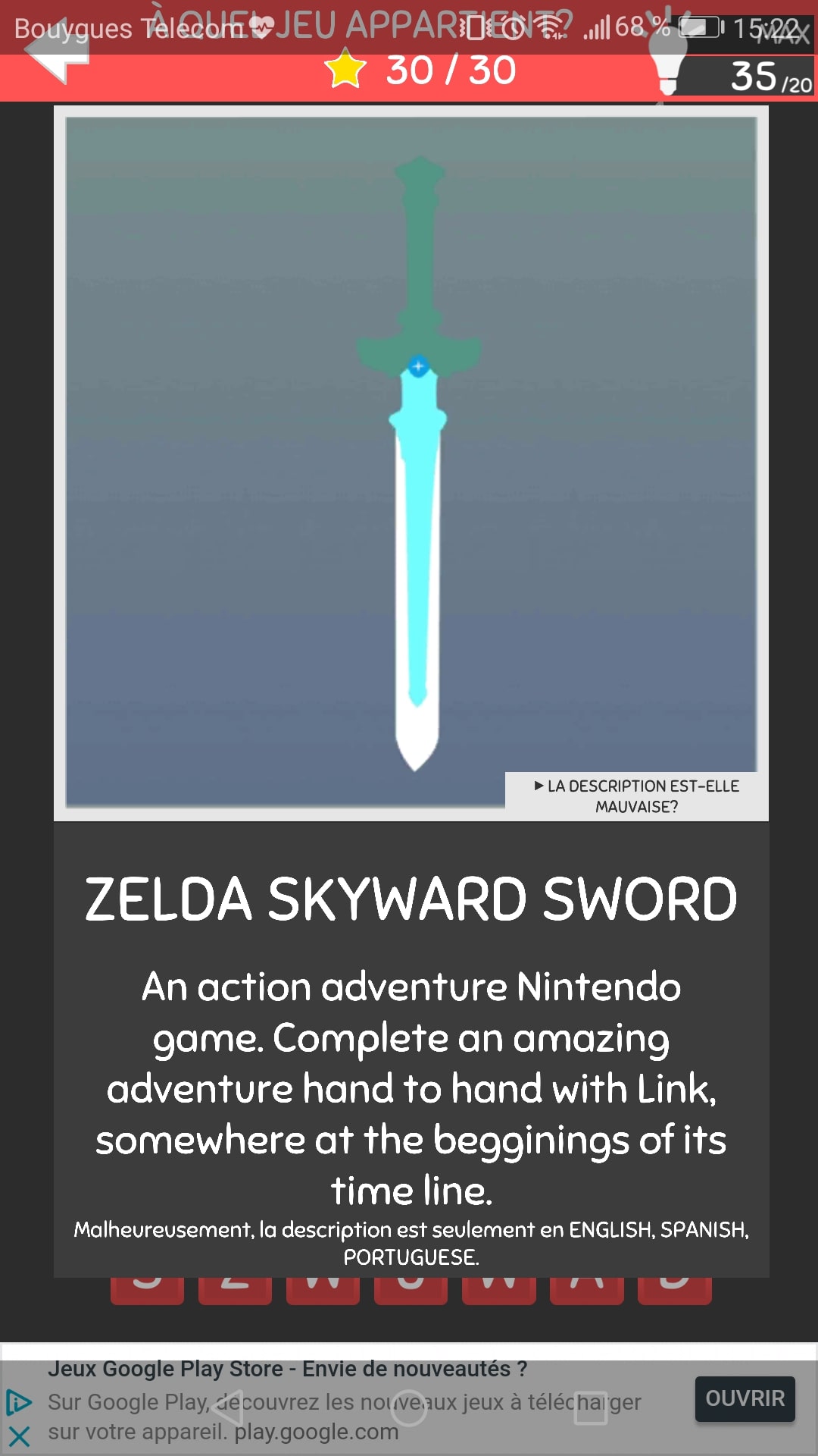 Mega Quiz Gaming est une application qui teste votre culture dite « gaming » à travers des images. Le principe est simple, il existe plusieurs thèmes et chacun comporte une trentaine d’images. Sous celles-ci, vous trouverez des lettres qu’il faudra reconstituer avec pertinence pour retrouver l’intitulé du jeu vidéo. Il est plutôt agréable d’y voir divers dessins ou symboles et presque jamais avec le même pinceau. Pour vous aider, l’application dispose d’un système d’indices que l’on obtient en obtenant des bonnes réponses ou en s’infligeant des dizaines de secondes de pub, ce qui n’est jamais agréable. C’est pourquoi, votre serviteur ici présent a sacrifié de son temps pour partager toutes les réponses du titre, si jamais vous en avez besoin.