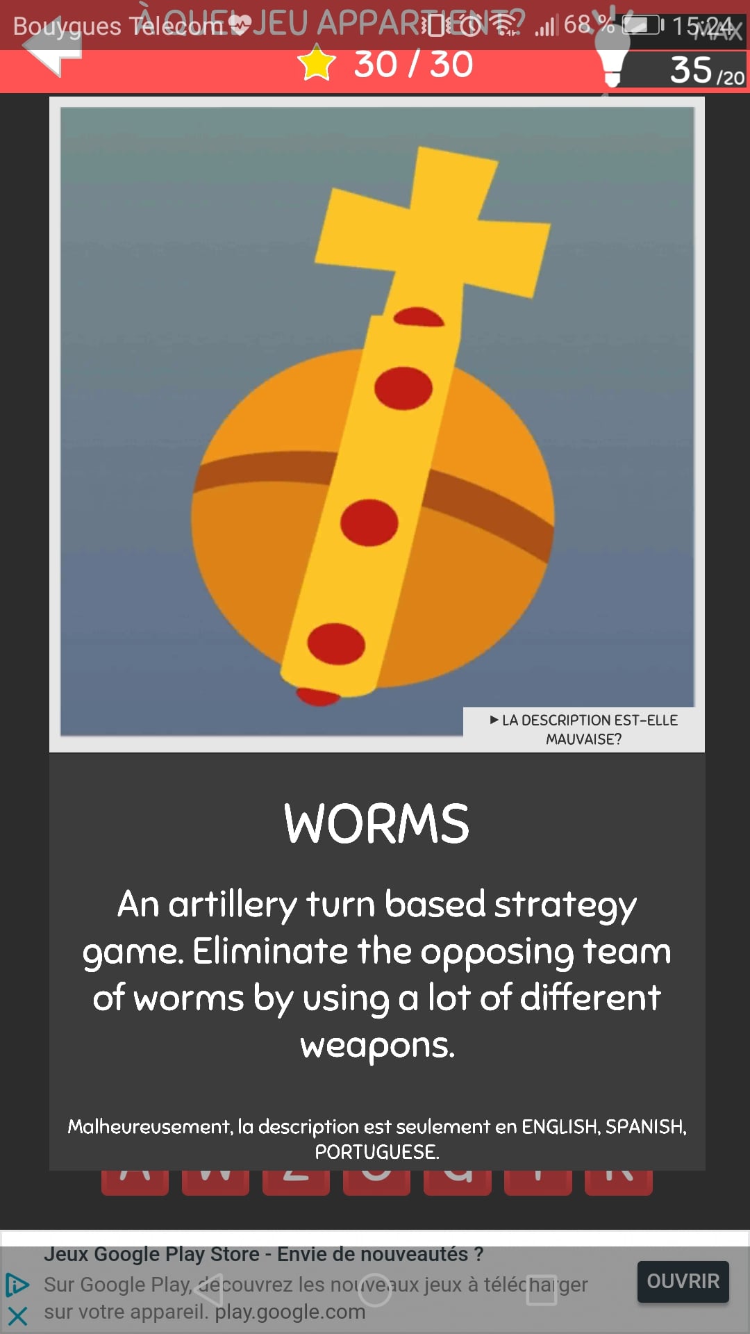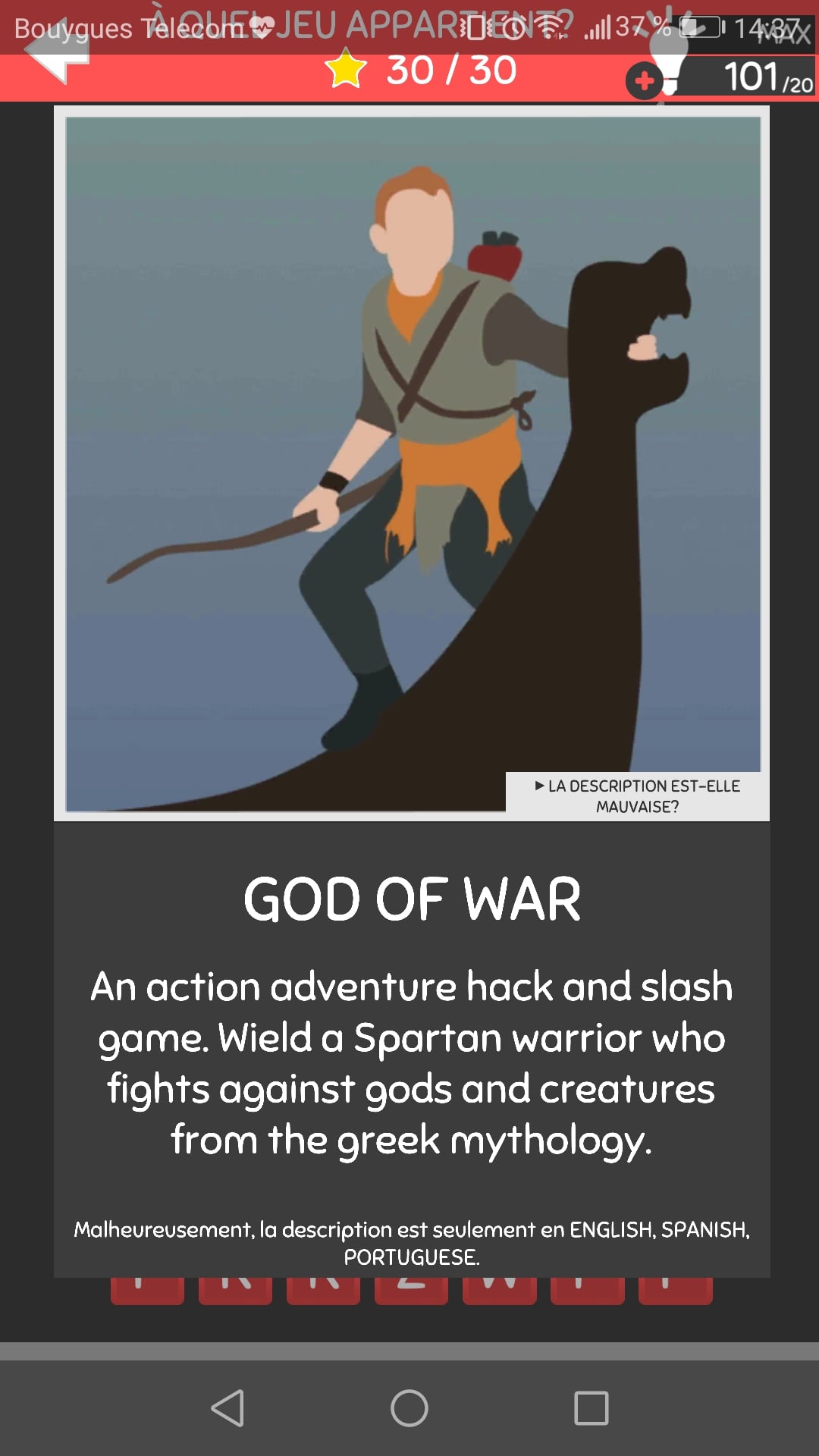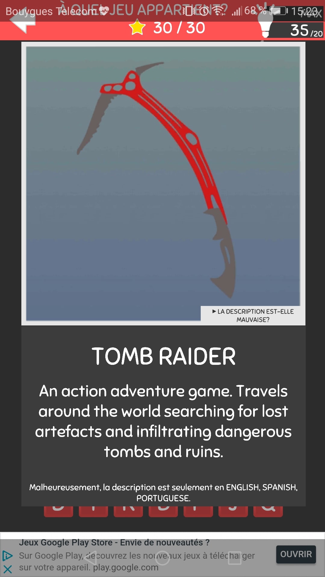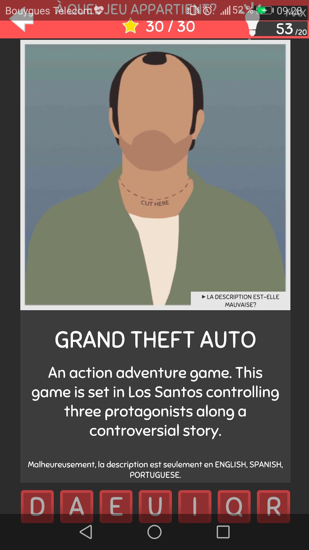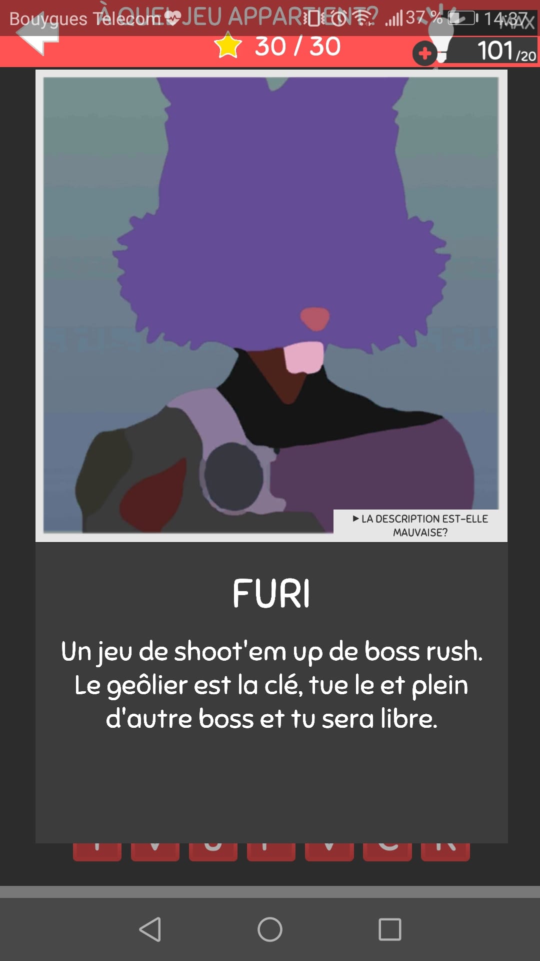 Mega Quiz Gaming est une application qui teste votre culture dite « gaming » à travers des images. Le principe est simple, il existe plusieurs thèmes et chacun comporte une trentaine d’images. Sous celles-ci, vous trouverez des lettres qu’il faudra reconstituer avec pertinence pour retrouver l’intitulé du jeu vidéo. Il est plutôt agréable d’y voir divers dessins ou symboles et presque jamais avec le même pinceau. Pour vous aider, l’application dispose d’un système d’indices que l’on obtient en obtenant des bonnes réponses ou en s’infligeant des dizaines de secondes de pub, ce qui n’est jamais agréable. C’est pourquoi, votre serviteur ici présent a sacrifié de son temps pour partager toutes les réponses du titre, si jamais vous en avez besoin.
