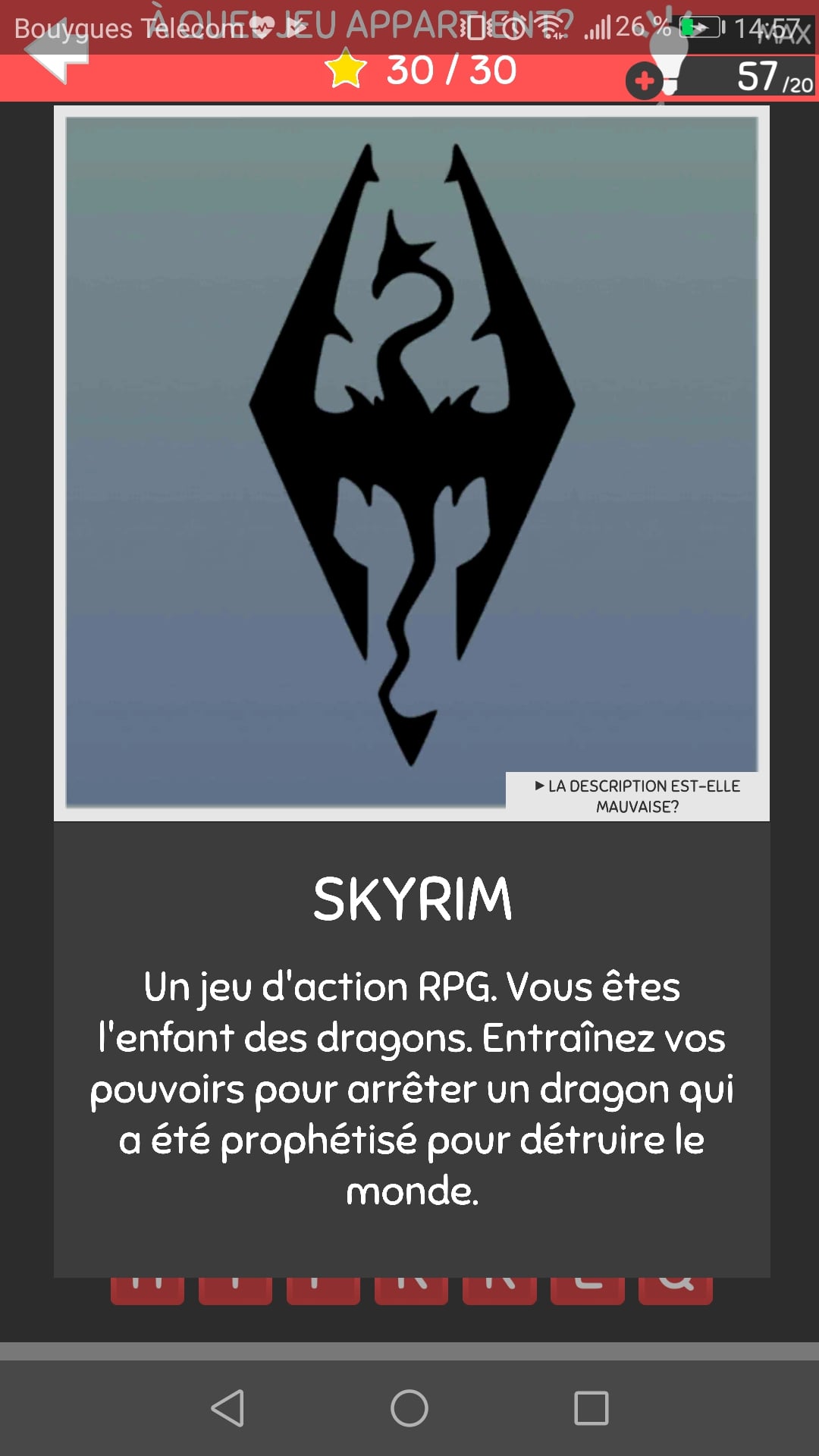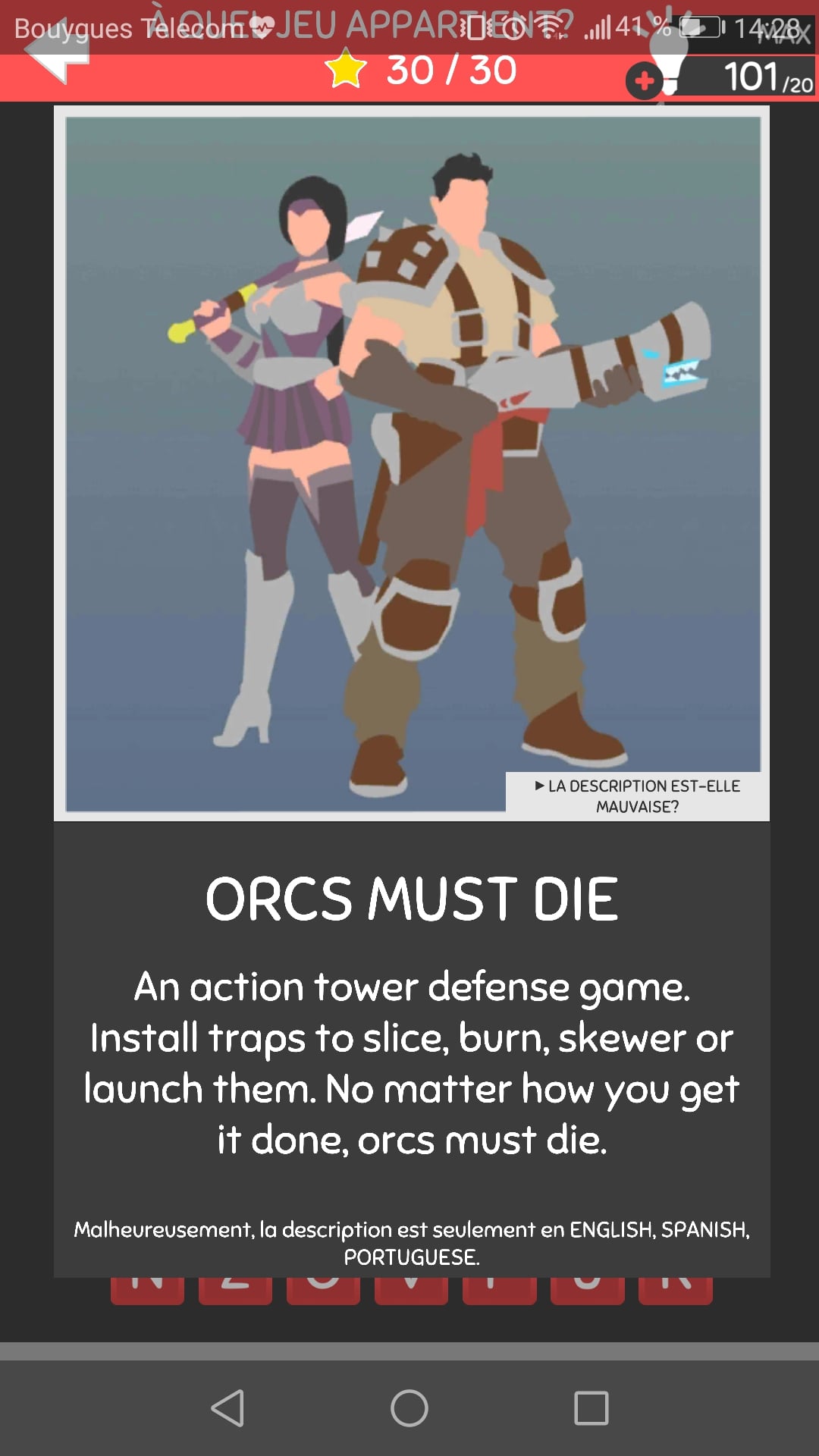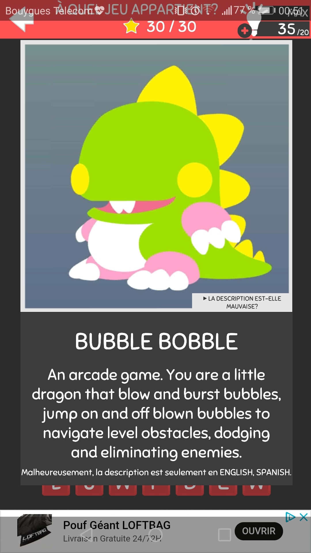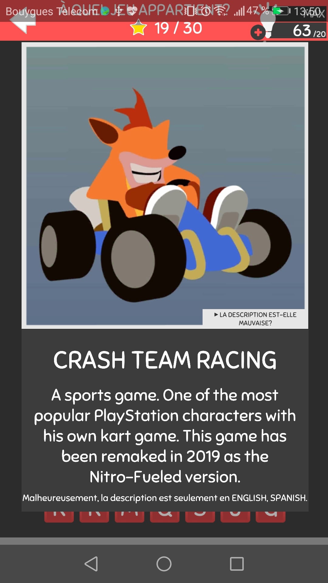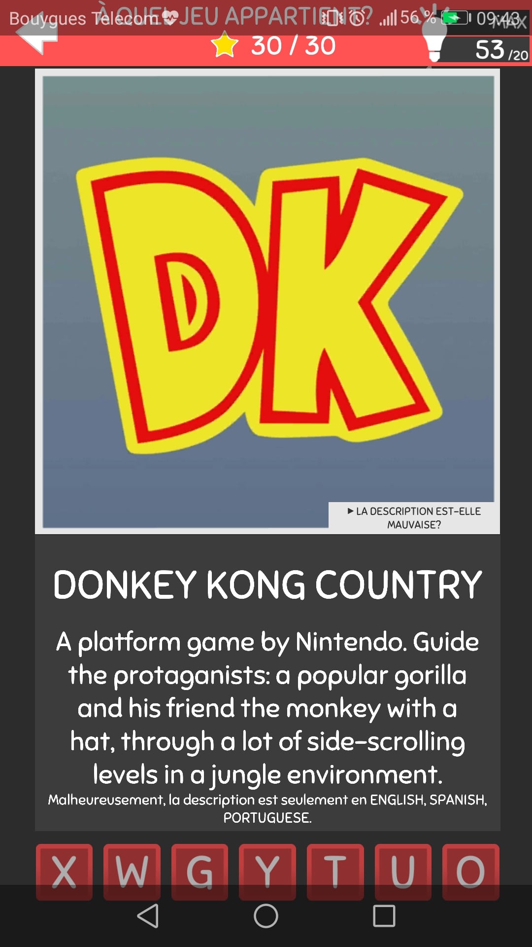 Mega Quiz Gaming est une application qui teste votre culture dite « gaming » à travers des images. Le principe est simple, il existe plusieurs thèmes et chacun comporte une trentaine d’images. Sous celles-ci, vous trouverez des lettres qu’il faudra reconstituer avec pertinence pour retrouver l’intitulé du jeu vidéo. Il est plutôt agréable d’y voir divers dessins ou symboles et presque jamais avec le même pinceau. Pour vous aider, l’application dispose d’un système d’indices que l’on obtient en obtenant des bonnes réponses ou en s’infligeant des dizaines de secondes de pub, ce qui n’est jamais agréable. C’est pourquoi, votre serviteur ici présent a sacrifié de son temps pour partager toutes les réponses du titre, si jamais vous en avez besoin.