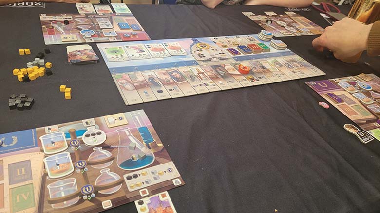 Florian Fay, avec qui nous avons pu discuter et jouer, s’est posé la question en ces termes : comment simuler en jeu de société la vie de Marie Curie ? Partant de la même volonté que Sur les traces de Darwin, Florian a déconstruit la vie de Marie en actions et tours de jeu.