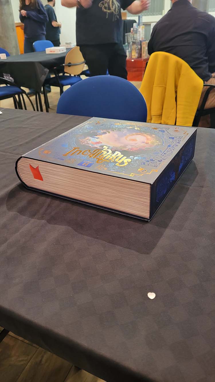 Nous n’avons pas eu le temps de nous essayer à Incantibus mais le jeu a gagné le prix de la plus belle boîte. Boîte qui se transforme en support de jeu dont la mécanique principale est la collection. Jeu de collection sur le thème de la magie avec une mécanique de sélection innovante (avec une baguette magique). On récupère des tuiles à coups de baguette, on doit bien les positionner sur notre plateau. Grâce à nos trouvailles, on peut récupérer de nouveaux types de tuiles.