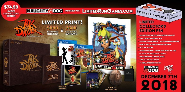 Limited Run Games, le distributeur de jeux vidéo américain, propose une édition standard et une édition collector au prix de 24$99 et 74.99$ du titre Jak and Daxter : The Precursor Legacy sur PlayStation 4. L’édition standard est proposée à 5000 exemplaires et l’édition collector à 2500 exemplaires seulement. Les fans de la série vont devoir faire vite s’ils veulent se procurer l’une de ces éditions.