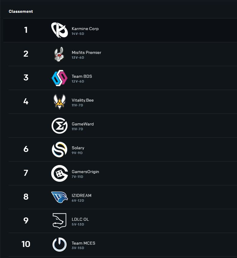 Superweek aussi pour la ligue française, et à l’issue de combats acharnés donnant parfois des upsets, le classement final est le suivant.