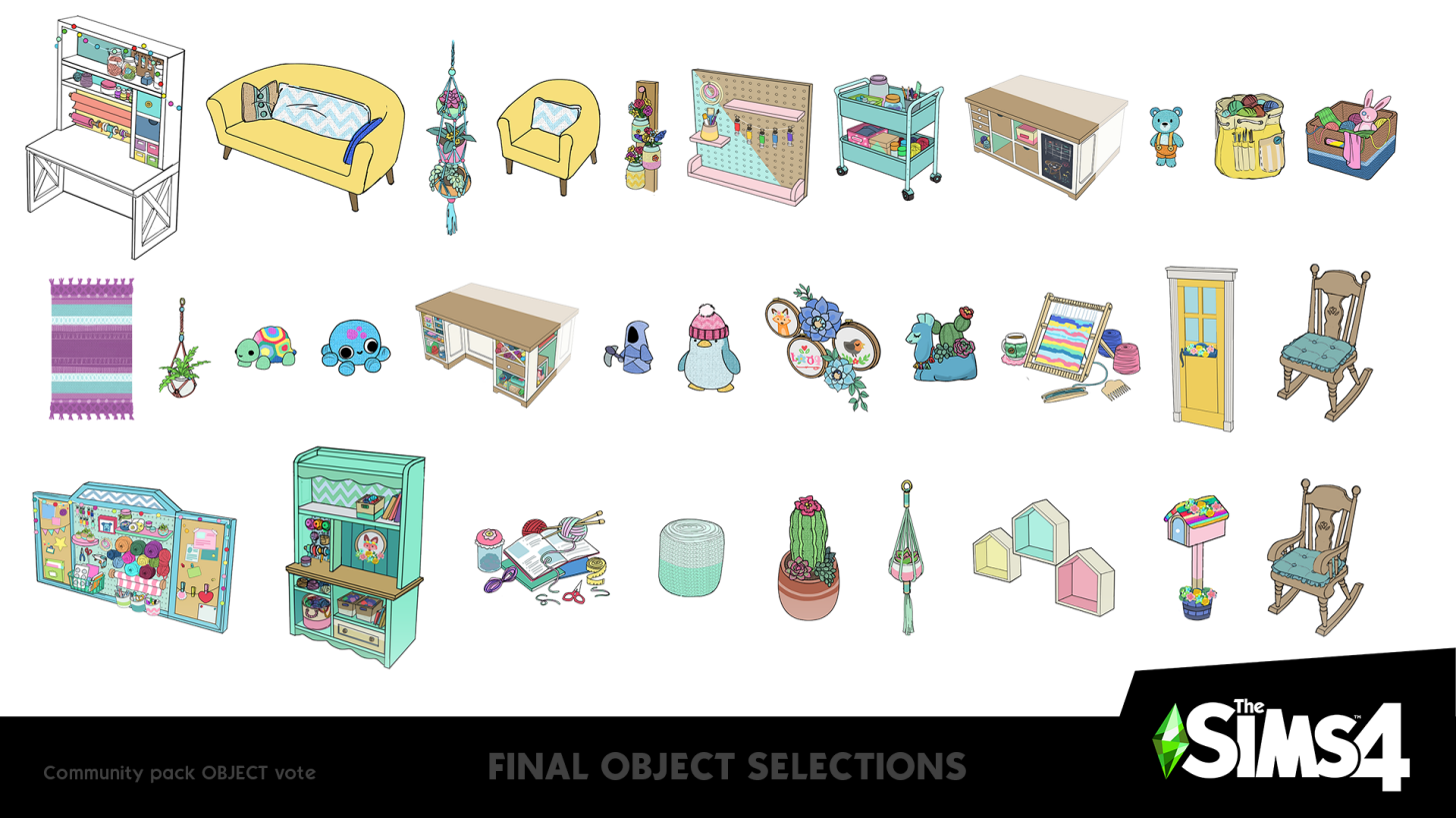 Le second d’entre eux, après avoir choisi le thème Travaux manuels avec un gameplay se concentrant sur le tricot, s’agissait de sélectionner le style artistique de ce nouveau kit afin de guider les infographistes concepts pour la création des objets et vêtements. Le gagnant parmi les divers proposé fut celui du Paradis des fans de travaux manuels (que vous retrouvez dans l’image ci-contre).