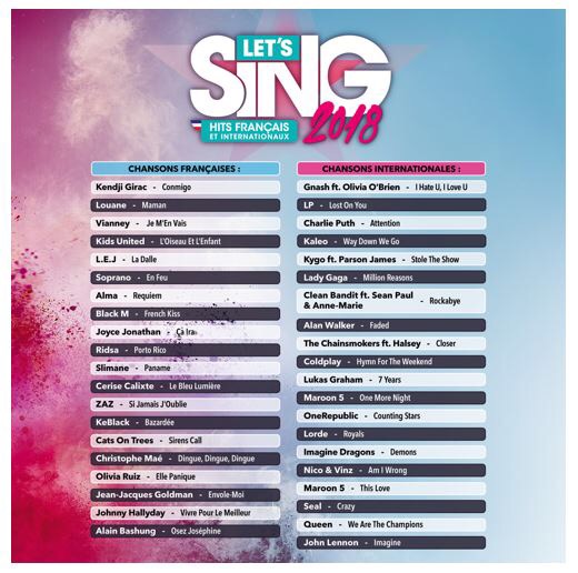 Au sommaire de cette nouvelle édition 40 tubes vous attendent ! Chantez en solo ou jusqu’à 4 sur PS4/Wii (seulement 2 sur Switch). La playlist recense des tubes français très populaires tels que Commigo de Kendji Girac, French Kiss de Black M ou encore Je m’en vais de Vianney. Du côté de l’international, on retrouve Mille Reasons de Lady Gaga, This Love de Maroon 5 ou encore We are the champions de Queen. Il y en aura pour tous les goûts ! Découvrez ci-dessous la playlist complète :