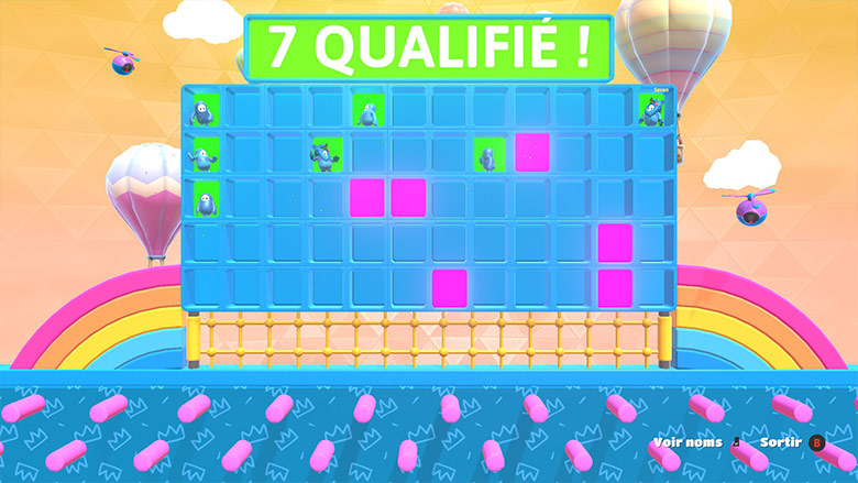 Grosse mention coup de cœur, d’ailleurs, au jeu de plateforme de dernière manche qui place les derniers joueurs sur des tuiles qui disparaissent après avoir marché dessus. Ce mini-jeu est constitué de plusieurs niveaux de plateformes, chacune composée d’hexagones qui disparaissent en passant dessus. Très technique et surtout tactique, l’objectif et de rester le plus longtemps possible sur les couches supérieures pour ne pas être dans les premiers à tomber tout en évitant de se caramboler avec les autres joueurs dont les pas réduisent également la quantité de surface disponible.