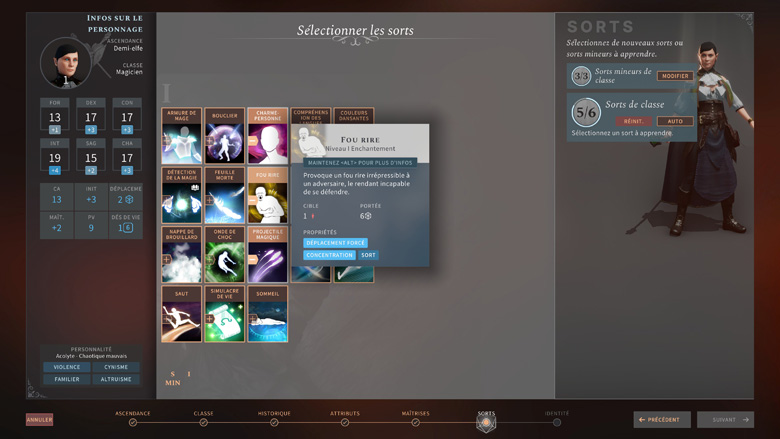 Mais pour en arriver là vous devrez passer par la création de personnages. Si Solasta Crown of the Magister propose des personnages pré-tirés, il vous permet bien évidemment de paramétrer chaque détail de la vie de vos avatars. Car nulle question de recruter des personnages au fil de l’aventure, ici les 4 de départ seront accouchés par vos soins. Et l’air de rien on avait rarement vu une création de personnage aussi riche, du moins sur l’aspect background. Sexe, race, classe, sous-classe et divinité lorsque ces cas s’appliquent, mais surtout origine sociale et alignement. Vous pouvez faire un roublard des rues ou universitaire, noble, etc. L’addition de vos choix permettra de définir des traits de caractères propres à vos personnages : Altruiste, cupide, égoïste, érudit, pragmatique, prudent, amusez-vous dans les combinaisons.
