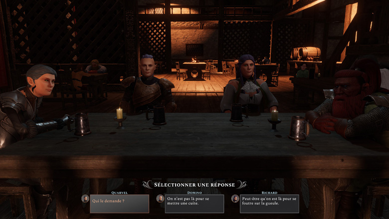 Quoi de mieux qu’un hommage à l’un des clichés les plus persistants pour commencer cette sainte mission de retranscription ? C’est bien autour d’une table d’auberge que vos aventuriers vont se retrouver pour narrer leurs péripéties les ayant amenés en ce lieu. Narration qui servira de tuto pour prendre en main les différents aspects du jeu : déplacement, inventaire, combat, furtivité, interaction avec l’environnement.