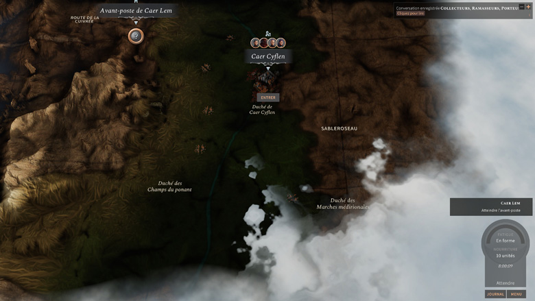 Un des aspects les mieux traités et des plus originaux concernant la partie trajets. La carte semble bien vaste, et aller de votre lieu de mission à la capitale vous prendra des jours. Jours qui seront simulés, durant lesquels vous aurez des comptes rendus sur l’activité de vos personnages : prière, entretien, récoltes, discussion, état de forme, jusqu’à une éventuelle rencontre en vue de créer de la violence entre les créatures du royaume (Baston !). Trajets qu’il vous faudra préparer à l’avance avec l’achat de rations (nul besoin de calculer au jour près, comme écrit en avant, les personnages peuvent chasser/cueillir/invoquer en chemin) et la planification du voyage allant de lent à rapide avec les risques inhérents à une traversée du royaume