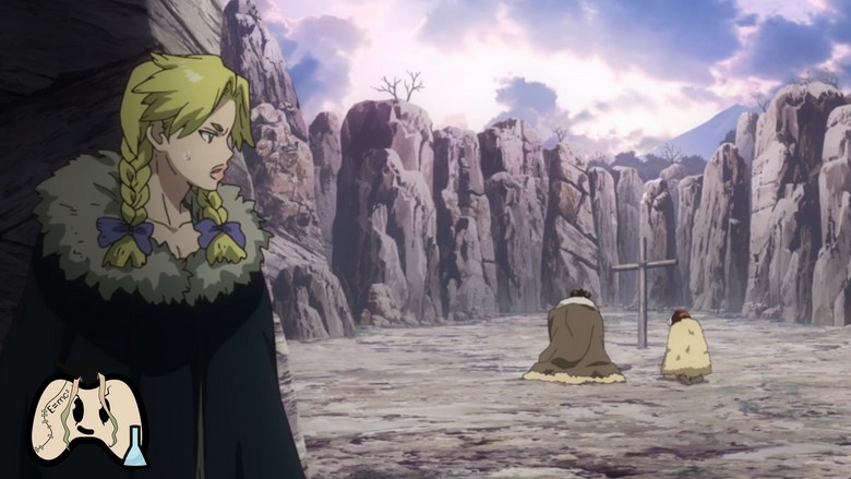 L’épisode commence avec les derniers mots qu’avaient prononcés Senku à Taiju et Yuzuriha. Ainsi que des images d’une curieuse tombe vers laquelle on les voit marcher. Puis on retourne sur les dernières images de l’épisode précédent (à savoir quand les bombes sonores explosent, créant une diversion pour l’excursion de Chrome, Gen et Magma).