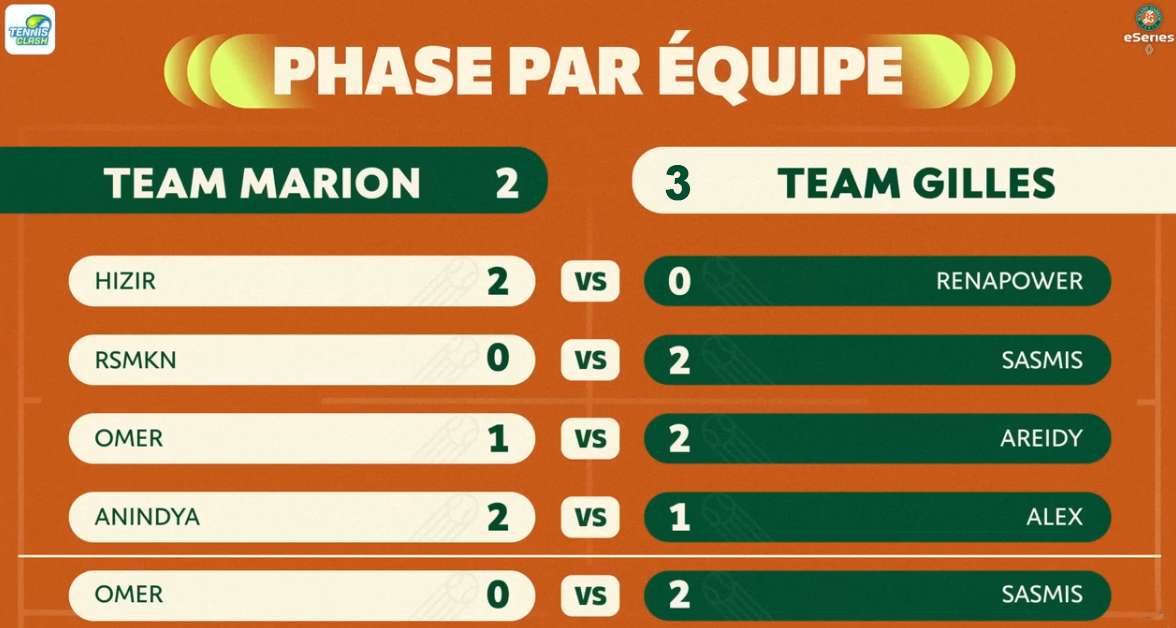 Les membres de l’équipe Marion se sont éliminés les uns les autres dès le début de leur tableau. Hizir a du se défaire de 2 membres de l’équipe Gilles descendus dans le loser bracket avant de se faire éliminer par Areidy qui réussira à arriver en finale par ce chemin. Mais Sasmis, le colombien était trop fort ce samedi, ne condescendant que 2 sets sur le tableau individuel.