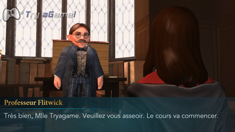 Sans réel impact, vous apprenez néanmoins que Rowan, elle, a hâte d’assister aux cours du professeur Flitwick. Et ça tombe plutôt bien puisque le premier cours à lequel vous allez assister est celui de Sortilège. C’est en ces lieux que vous apprendrez le sort Lumos. Mais avant cela, l’enseignant vous dit que votre frère était l’un des élèves les plus doués mais également le plus indiscipliné. Il vous pose donc la question suivante qui influera sur votre histoire « Comptez-vous suivre le règlement ? ». Selon votre réponse, vous obtiendrez des points en Courage (bouclier vert), en Empathie (cœur rose) ou en Savoir (livre bleu) . Vous pouvez répondre :