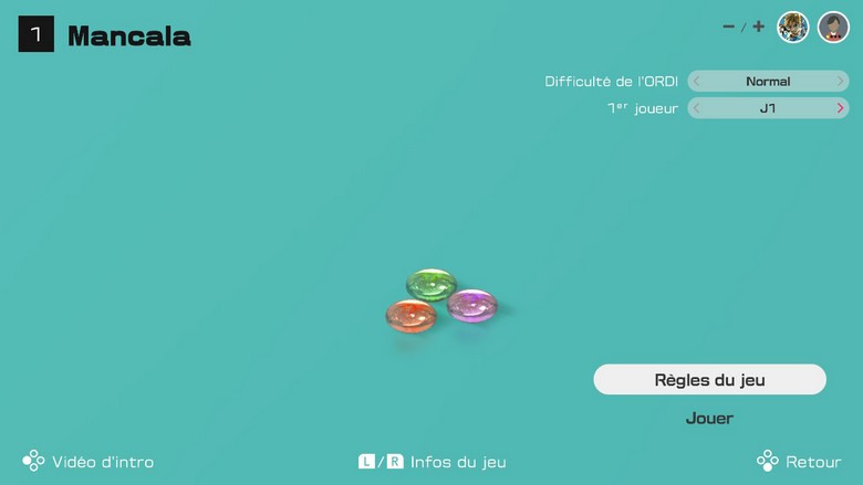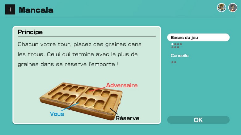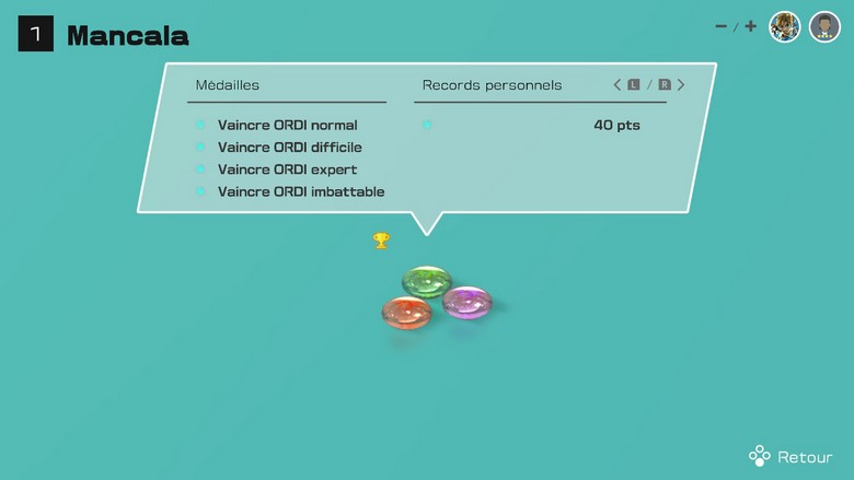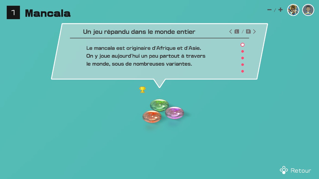 Vous avez également, en fonction du titre choisi toujours, différents paramètres à sélectionner que ce soit la difficulté de l’ORDI, qui des joueurs sera celui qui commence (entre autres bien entendu)… La difficulté de l’ORDI se sépare en 4 niveaux : normal, difficile, expert et imbattable. A chaque victoire contre l’un des niveaux, en plus de gagner respectivement une médaille de bronze, d’argent, d’or ou une petite coupe, l’ORDI progressera de lui même vers le niveau supérieur et vous pourrez également débloquer une anecdote sur le jeu sélectionné. En effet, une ou plusieurs anecdotes sont à découvrir pour chacun des 51 titres, afin d’en apprendre un peu plus sur ces jeux qui ont façonné les cultures du monde entier. Si vous avez joué à un jeu mais que vous n’êtes pas sorti victorieux, une coche verte s’affichera au-dessus du titre. Ainsi, lorsque vous vous retrouvez sur l’écran d’affichage des 51 jeux, vous pourrez savoir où vous en êtes dans votre progression.