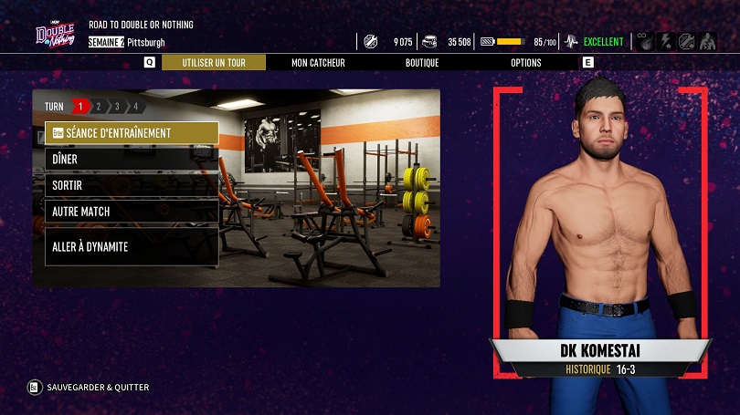 Pour conclure les modes, on trouvera la Road To Elite qui fera office de mode histoire. Tiens, détaillons-le. Il fonctionne selon des arcs scénaristiques qui tournent autour de quatre grands PPV de la compagnie : All Out, Full Gear, Revolution et Double or Nothing. Chacun des arcs se déroule en 4 tours (qui représentent des semaines) durant lesquels il faudra faire progresser son personnage en le faisant s’entrainer et combattre. En effet, ces actions nous donnent la possibilité de gagner des points de compétences à dispatcher dans différents attributs. Attention, ces améliorations ne sont possibles que pour des combattants créées. Les vrais catcheurs eux, même si on peut les sélectionner pour le mode histoire ne pourront pas être améliorés. Inutile donc.