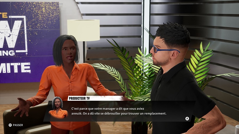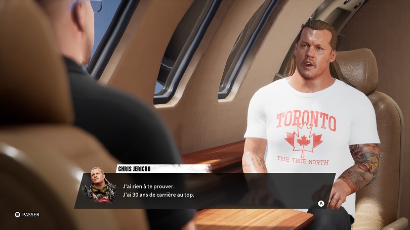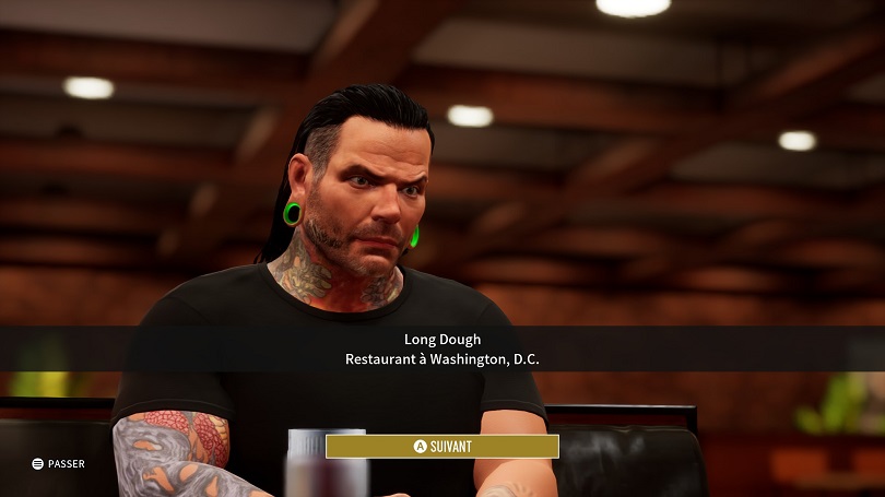 En plus du gain de point de compétences, il faudra gérer l’énergie et le moral de son poulain. Pour cela il faudra par exemple le faire manger au restaurant pour recharger les batteries ou bien aller à la rencontre des fans pour se booster un peu l’égo. Ne vous méprenez pas, ces fonctionnalités ne cassent pas trois pattes à un canard. Il ne s’agit en réalité que de simples cut-scenes sans réel intérêt. Le hic c’est que le reste de la narration est du même acabit. Les différentes storylines ne vont pas bien loin et s’appuient peu ou prou sur de vraies feud de la AEW. Le fait qu’il n’y ait aucun doublage retire également toute vie aux scénario. Seul un Jim Ross rincé vient introduire les maigres enjeux de nos combats. Je dis rincé puisqu’on a l’impression qu’il a prêté sa voix sous la contrainte tant il n’y met aucun enthousiasme.