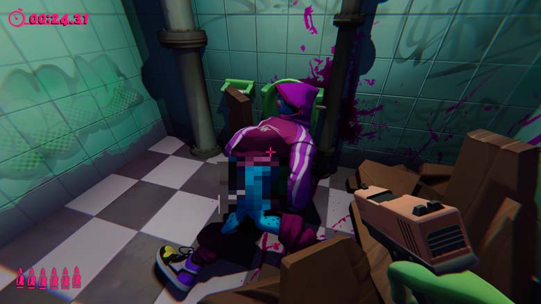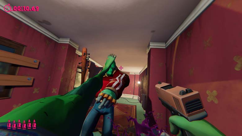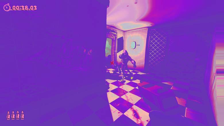 Anger Foot se joue avec 3 touches. En plus du déplacement, on saute, on tire et surtout on colle des front kick. Le tout dans une montée d’adrénaline que je n’avais pas ressentie depuis Hotline Miami, mécanique de un tir un mort oblige. Alors oui des fois on la joue fps pour finir un niveau pour la première fois mais la philosophie est bien de foncer et de tout fracasser. En même temps venant du studio qui nous avait livré Stick it to the Stickman…