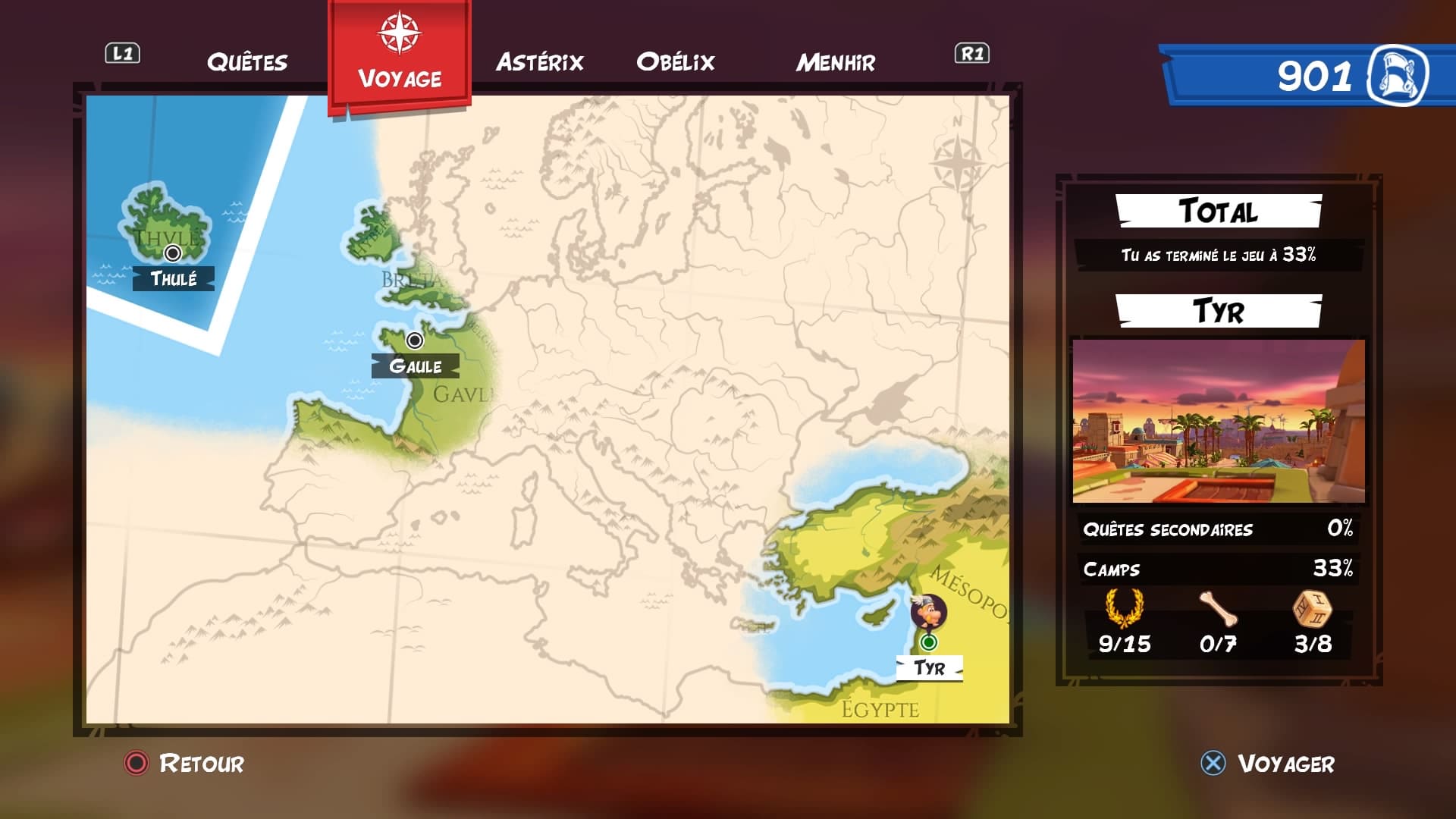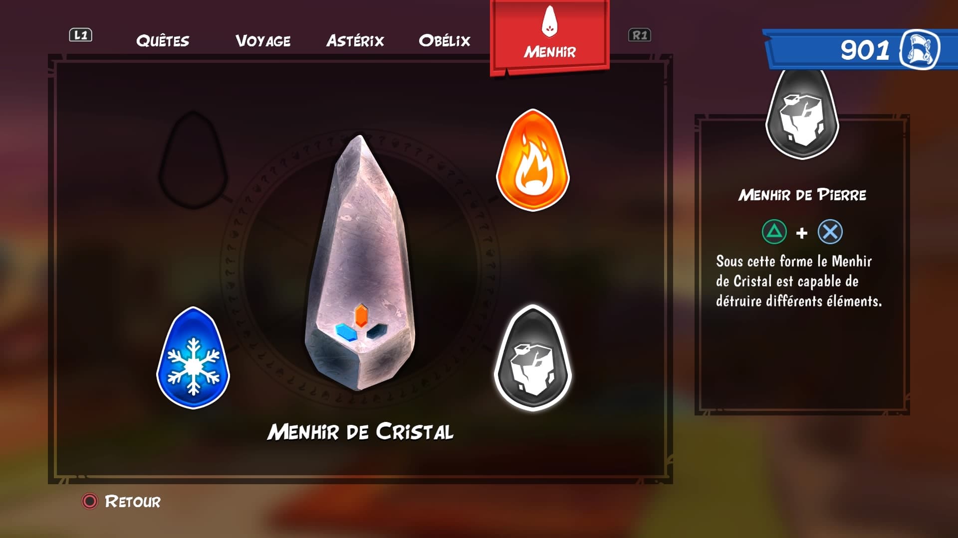 Si c’est un gros lourdaud, Obélix peut au moins profiter d’un Menhir aux multiples possibilités. Quatre pour exact. Nous commençons donc avec le Menhir de Pierre, simple mais efficace. Son onde de choc permet d’étourdir les ennemis pour un petit laps de temps. Ensuite, on acquiert le Menhir de glace qui peut geler les adversaires et donc les ralentir. Ce qui est forcément utile quand vous avez une troupe de Romains à vos basques et qu’il est impossible de s’en débarrasser en deux temps, trois mouvements. Puis, on obtient le Menhir de feu. Celui-ci se montre vraiment utile puisqu’il peut brûler les légions romaines mais aussi l’environnement et débloquer certains passages. Sans oublier qu’il nous permet d’explorer des recoins sombres grâce à la lumière naturelle qu’il créé. Enfin, le Menhir Magnétique qui aura ses propres caractéristiques, activer des mécanismes et un bouclier.