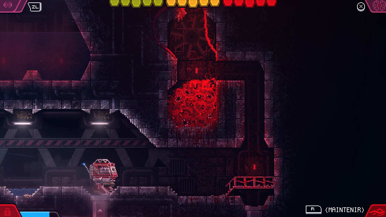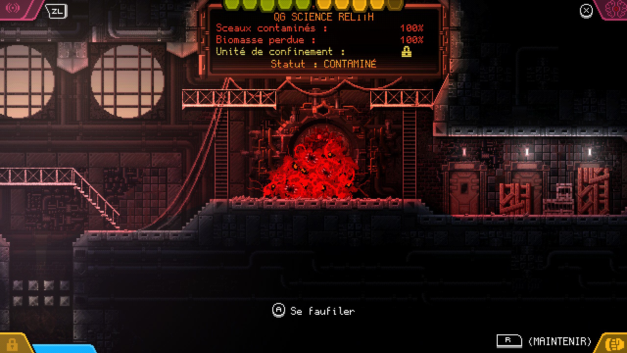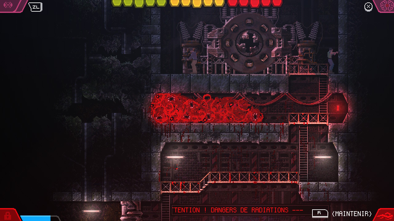 carrionSi le gameplay est bien pensé et crédible avec vraiment ce sentiment de puissance qui rend le jeu plutôt facile à vrai dire, la maniabilité avec le Joycon droit manque de précision pour contrôler un tentacule. Pour le coup, la manette pro est plus adaptée et de ce fait, les phases de « combats » moins rageantes, surtout lorsqu’elles sont un peu fouillis. Heureusement, les phases de réflexion ne souffrent pas de ce manque de précision. Les énigmes sont bien pensées et le level design aussi, ce qui rend l’expérience générale très plaisante. Comme dit plus haut, un poil de scénario et de méta auraient été les bienvenus bien que la fin explique cela…