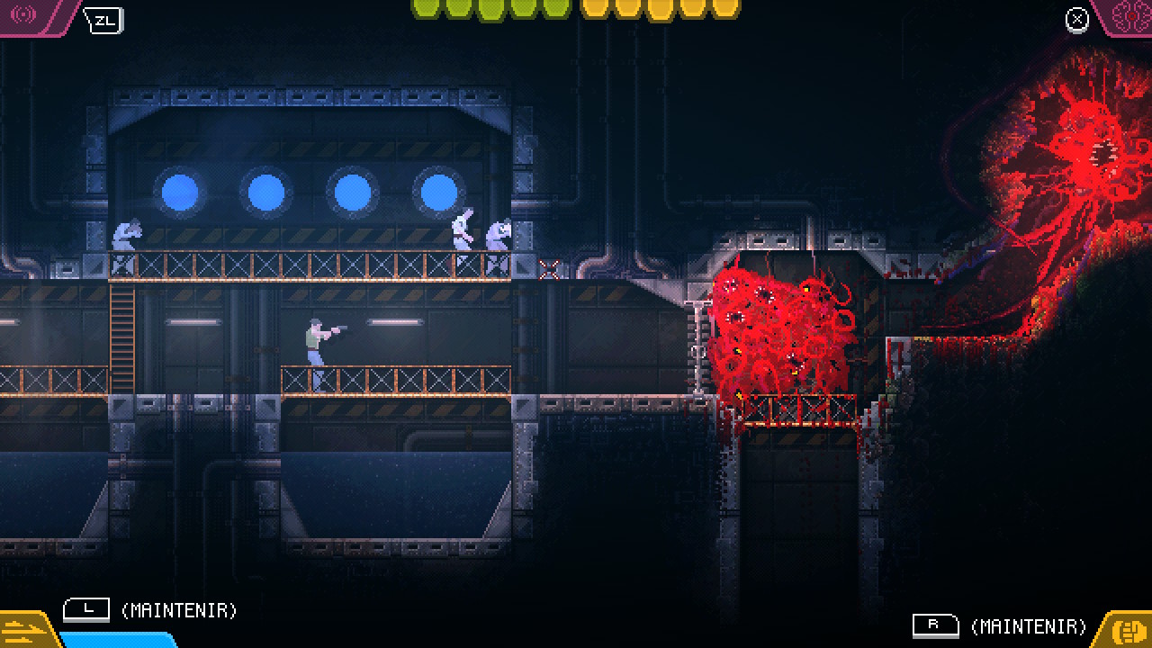 L’éditeur américain Devolver Digital connu pour ses jeux gore et sanglants (Hotline Miami, Ape Out, Katana Zero) nous propose ici Carrion. Un jeu où l’on incarne un monstre protéiforme à la puissance démesurée tentant de s’échapper d’un centre de recherche hautement sécurisé. Le joueur se retrouve donc de l’autre côté du miroir avec des humains plus ou moins inoffensifs pour ennemis. L’aspect 2D tout en pixel art du jeu donne un bon gros côté rétro comme on les aime sans pour autant nuire au plaisir. Nous y reviendrons plus en détails dans ce test de Carrion.
